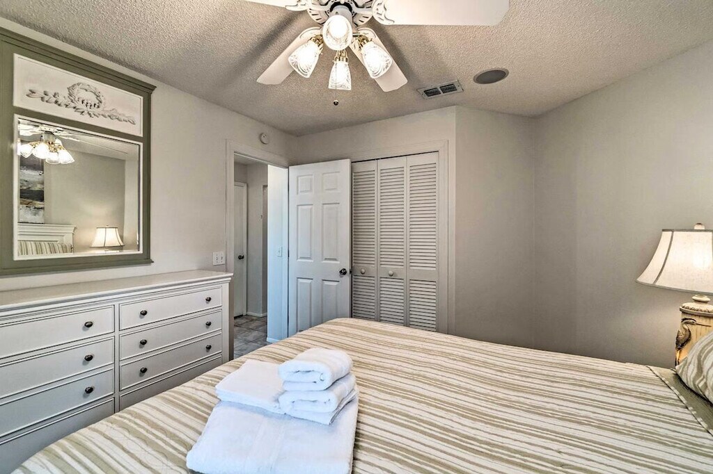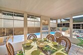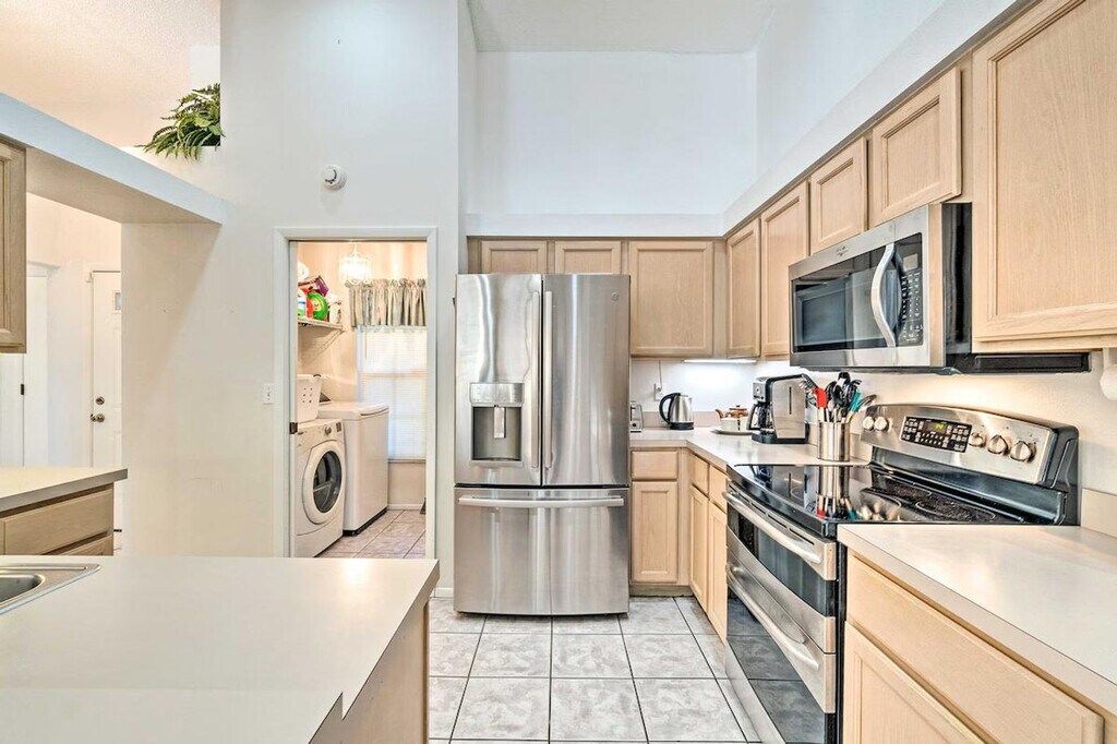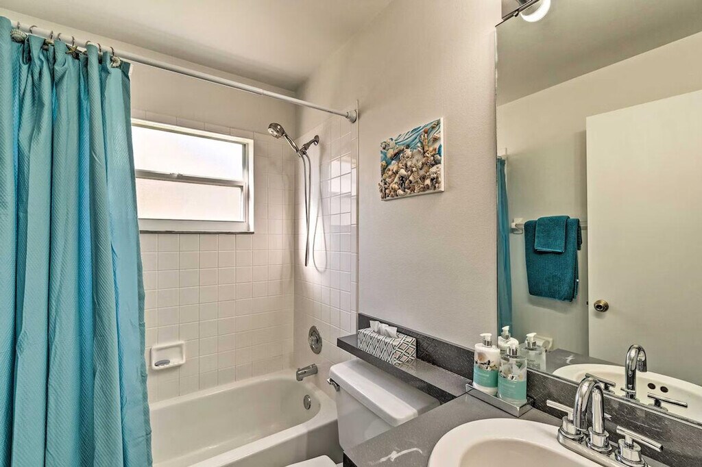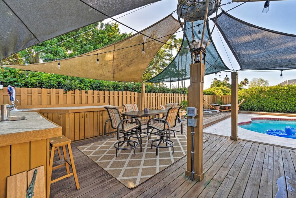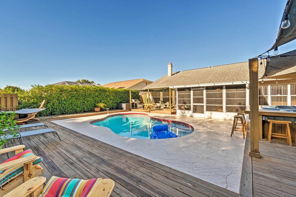 Feel at home in this bright 3-bedroom, 2-bathroom vacation rental in Bradenton, offering 1,600 sq ft of living space. This airy home features an open layout, a fully equipped kitchen with stainless steel appliances, and an outdoor entertaining area. The eat-in kitchen includes a breakfast bar, dishwasher, 2 full knife sets, tea kettle, toaster, drip coffee maker, cooking basics, spices, dishware, and flatware. Enjoy modern amenities such as free Wi-Fi, linens/towels, a washer/dryer, complimentary toiletries, a first aid kit, air conditioning, trash bags, paper towels, and beach towels and chairs. Entertainment options include 3 flat-screen cable TVs with Netflix, cable, and a screen porch with a dining table. The outdoor oasis is fenced and includes an outdoor bar with beer taps and stools, an outdoor dining table, a deck with cushioned seating, a gas grill, lounge chairs, a hammock, a private pool, pool toys, and bistro lighting. A pet is welcome with a $500 fee. Parking is available in the garage (1 vehicle), driveway (2 vehicles), and on the street. Ideally located near the IMG academy, this home is perfect for golfers and beach-goers. When you're not enjoying the private pool or hot tub, hit the links at Manatee County Golf Course or stroll along Coquina Beach's white-sand shores. Events, parties, or large gatherings are not allowed. Guests must be at least 25 years old to book. This single-story home offers step-free access. Exterior security cameras are located at the front of the home, facing out, and an interior security camera is located in the entryway, facing the front door. Motorcycles must be parked in the garage. Commercial vehicles must be parked in the garage or on the street. [SI]