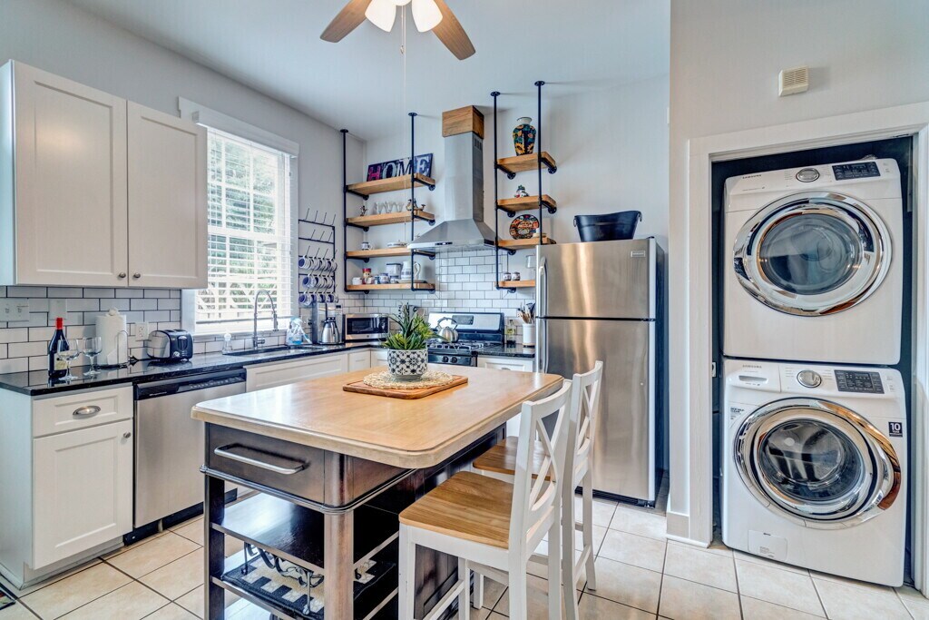 A perfect place to call home while you are here for work or getting to know the wonderful city of Savannah. A bright living room with hardwood floors, a charming fireplace and spacious dining area leads to a fully equipped modern kitchen. The kitchen has plenty of shelving, stainless steel appliances, granite countertops, and an eat-in a bar space. The first floor has a half bath and a stacked washer and dryer. 2 bedrooms and 2 full bathrooms are located on the second floor. This end unit has off street parking, a large deck and a fenced in patio. It is pet friendly and located minutes from all the best parks, restaurants, shops and vibrant historic culture of downtown Savannah, and only a short drive to Tybee Island as well.