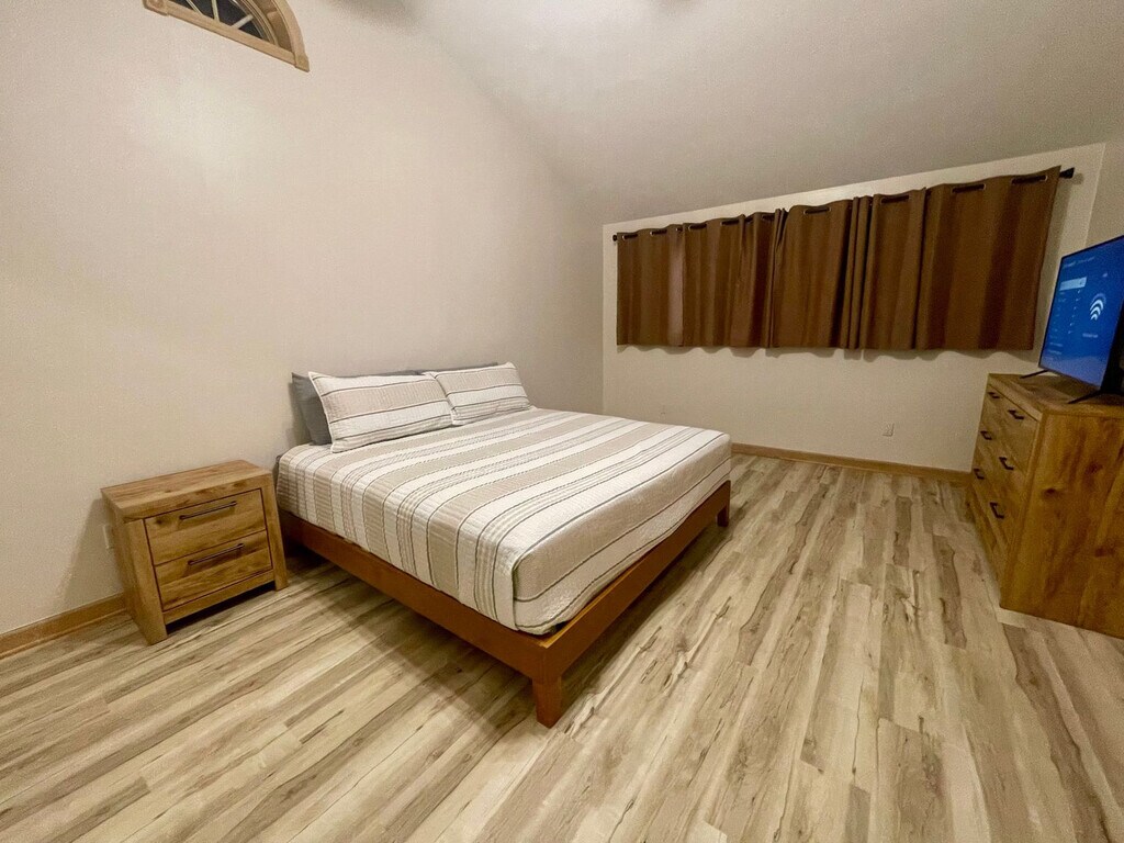 Feel at home in this 1-bedroom apartment located above a commercial space. This upstairs unit features a king-size bed and a gas fireplace. The apartment is equipped with two Smart TVs, one in the bedroom and another in the living room, and includes a chaise sofa for added comfort. The outdoor landing provides a table and two chairs. The apartment is located on Pine Lake Avenue in an area with a mix of residential and commercial properties. Uber/Lyft is available. Prior to your stay, you are required to complete a pre-arrival form and upload your driver's license or passport and sign and agree to our rental conditions. There is no washer/dryer in the unit. [SI]