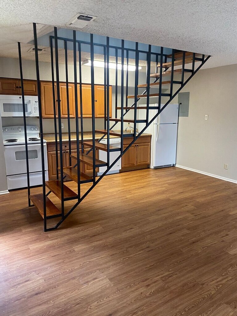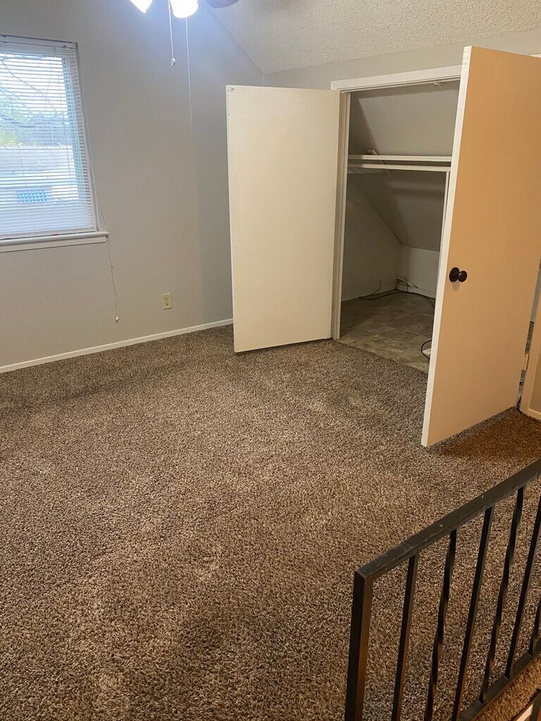 Affordable Apartment with kitchen and living downstairs. Bedroom and bathroom are upstairs with a large closet. Fenced patio. Parking for only one vehicle.