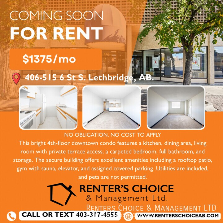 NO OBLIGATION, NO COST APPLICATION PROCESS PRICE: $1375 Condo Apartment: Kitchen Dining Area Living Room featuring Private Terrace access Carpeted Master Bedroom Bathroom - 4pc Storage Room FEATURES: 4th Floor Unit with Lots of Natural Light Downtown Condo Complex features Rooftop Patio, Garden Terrace, Activity Room, Elevator, Gym with Sauna, Secured Entry, Onsite Mail Delivery, Coin-operated Laundry with Wash Sink & Folding Table and Secured Covered Parkade. PARKING: Parkade - Assigned Stall (#29), single car Street Parking (the City has Parking Passes available for Residents) APPLIANCES: Fridge Stove Dishwasher PETS: Sorry, No Pets UTILITIES: Power, Gas & Water Included Assigned Covered Parking Close To Bus Stop Close To Shopping Convenient To Amenities Downtown On Site Laundromat