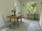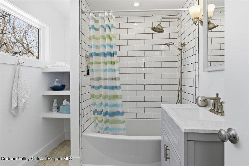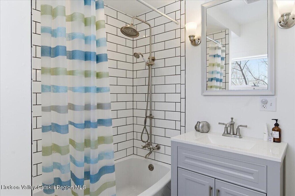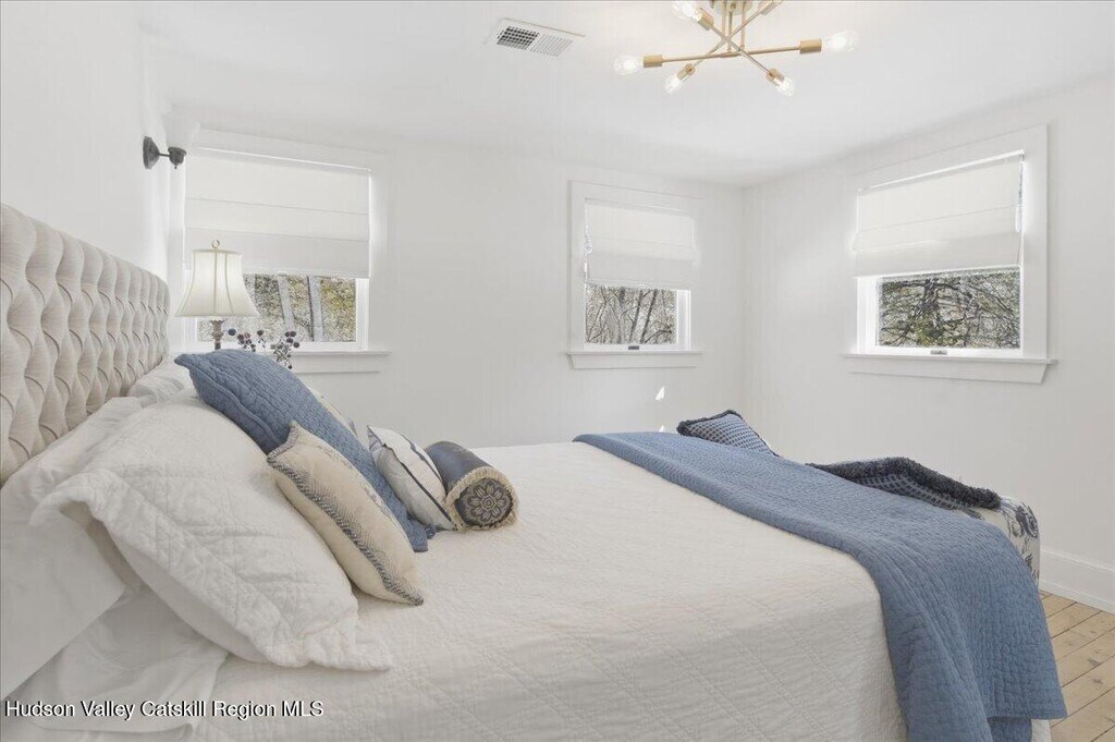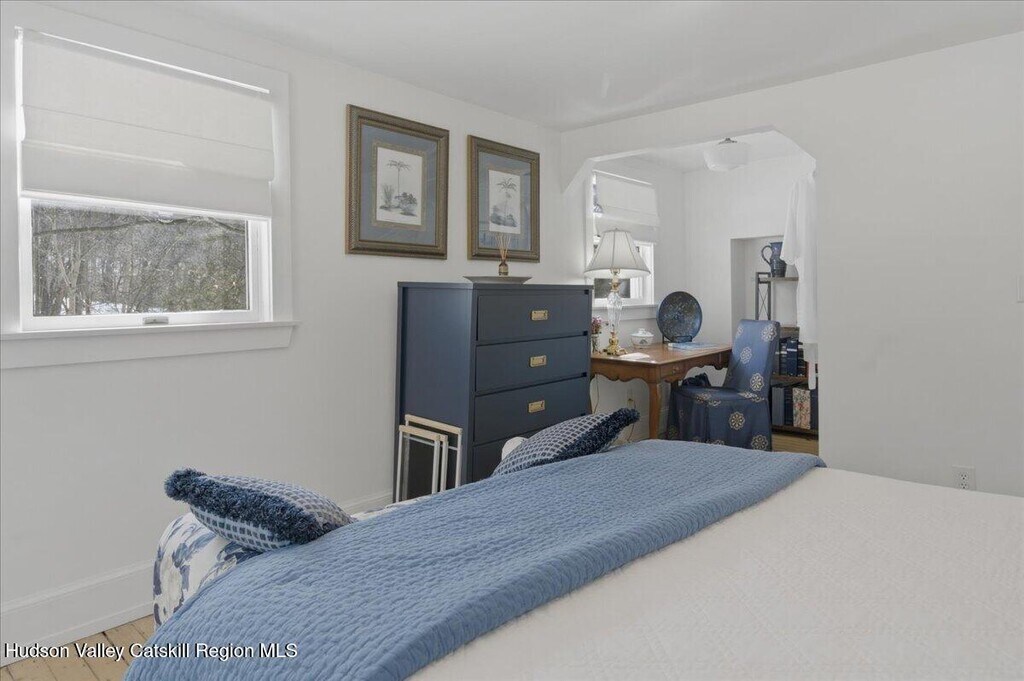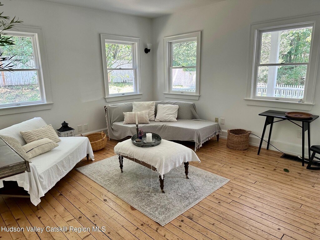 This modern Germantown Farmhouse sits on just over an acre,is located near the Roeliff Jansen kill trout stream and just minutes to Hudson. Built in 1890,the house features high ceilings with exposed beams,antique wood floors,updated kitchen and baths with new glass and tile shower enclosures and a free standing soaking tub. The dining room with direct access to a private deck has views of the Catskills for great Frederic Church sunsets. There is a ground level bedroom,den,or office off the kitchen and dining area. Upstairs,there is a primary bedroom ensuite with balcony,and a guest room. The house is energy efficient and fully green foam insulated. The picture perfect white picket fence and front porch give it a good presentation. It's only a 1/4 mile to the Hudson River. Ten minutes from Hudson,train station and to Bard and Germantown. Come have a look!
