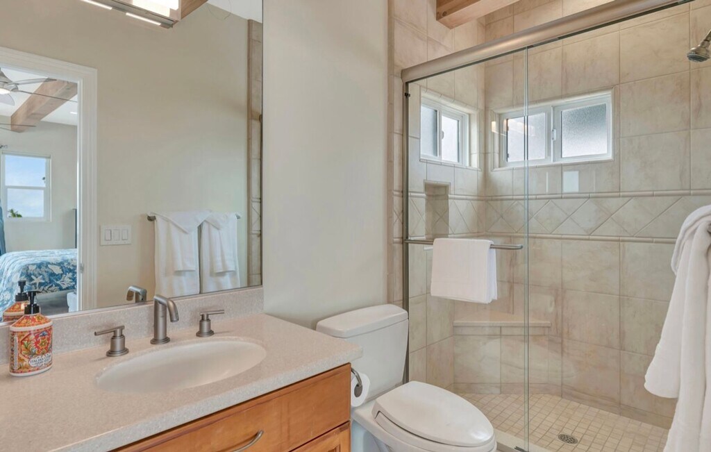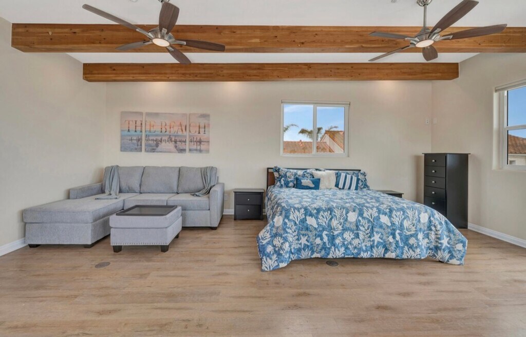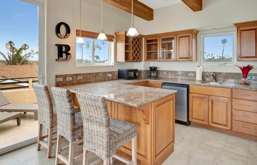 Fully Furnished with everything you see. 2 story detached house. Only 1 block to the beach and best restaurants in Ocean Beach. 3 bedrooms, 3 baths, 2 kitchens, 3 decks. Hard surface flooring throughout. First floor features a beautiful & bright fully stocked kitchen. Granite countertops, stainless steel & high end appliances. Eat at kitchen bar. Separate dining room. Large living room with two decks with ocean views. Wood beamed ceiling. 2 large bedrooms on entry floor. One has private bathroom. Second floor has loft style primary bedroom with large view deck. Open master with king size bed plus pull out sofa. Sweeping ocean views. Second kitchen located off of master bedroom. Granite counterops and walk up bar area. Outdoor shower. Plenty of parking for up to 4 cars. Pets considered on case-by-case basis and require additional deposit. Please contact us directly for availability. Utilities included based on length of lease. Garage access not included. Renter’s insurance required.