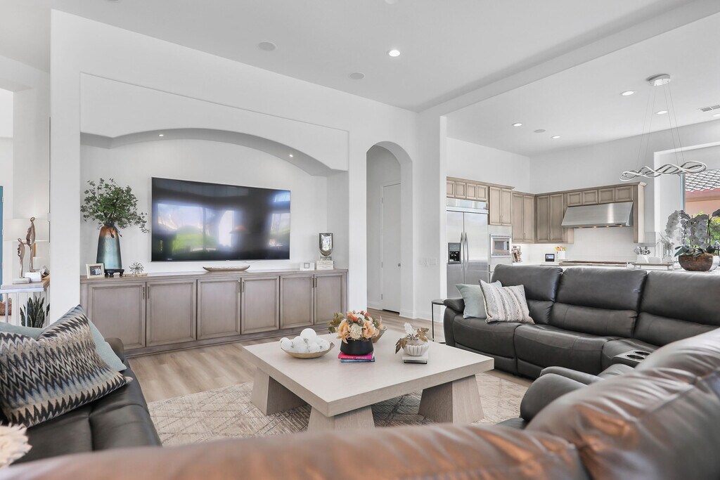 Arroyo and green belt views plus panoramic mountain views on the left across two fairways and a lake. Outdoor living at its finest with a spectacular infinity pool plus adjacent wading pools with fountains,two stacked rock spills - one from the spa; the other from the firepit. And there's an outdoor kitchen and a sprawling sundeck. The courtyard entry leads you into a soaring 18',skylit rotunda foyer that opens up to BIG a big 43' Great Room,a big 17' Office/Den,a big 18' Family Room; a big 35' Master Suite over 4400 sf. of spacious luxury. Guests?...a courtyard casita plus two guest rooms with their own sitting room 9or family room). The Great Room with its bow-window dining room captures the view and is perfect for entertaining. The feature list is endless - dramatic 12' soffited ceilings,8' doors,gourmet kitchen,Jacuzzi tub and separate shower in master bath,recirculating hot water,switch-start fireplace,etc.