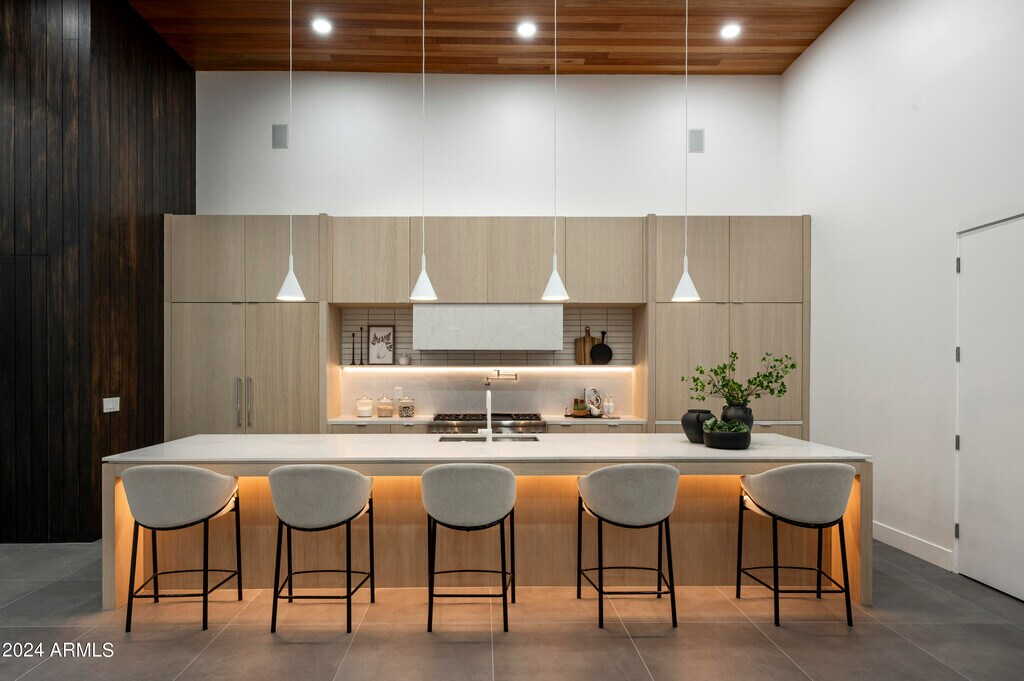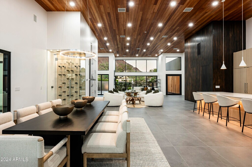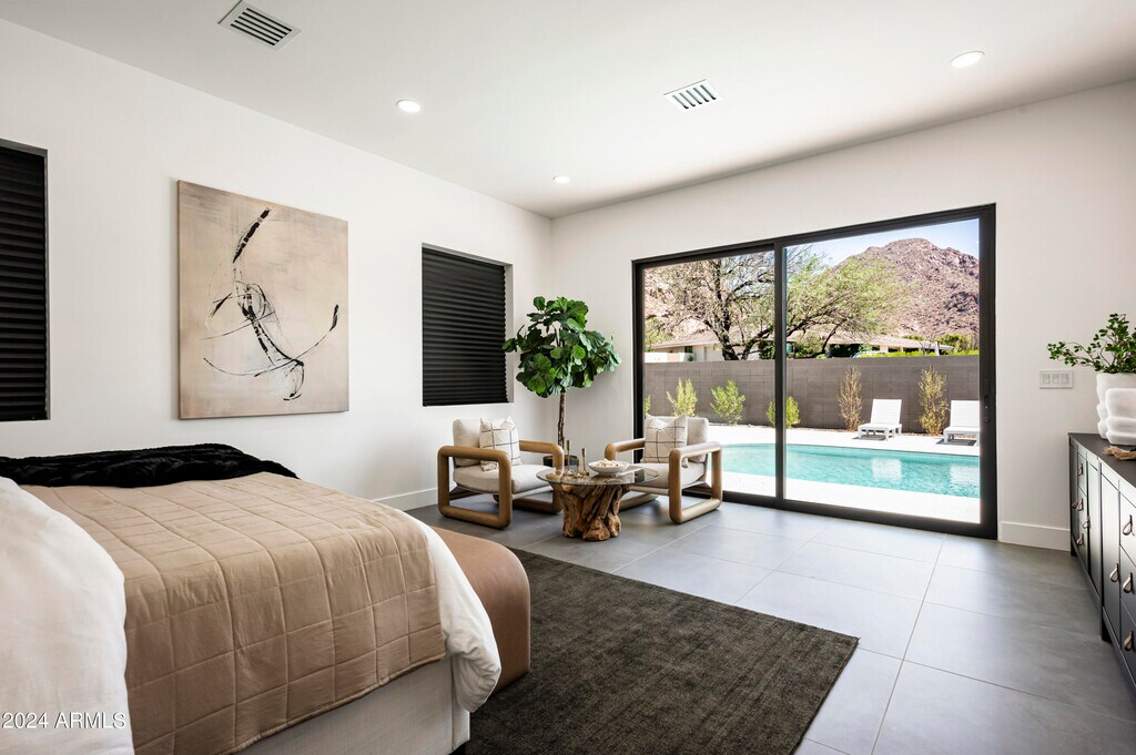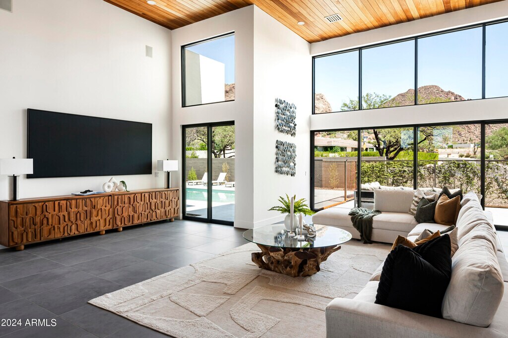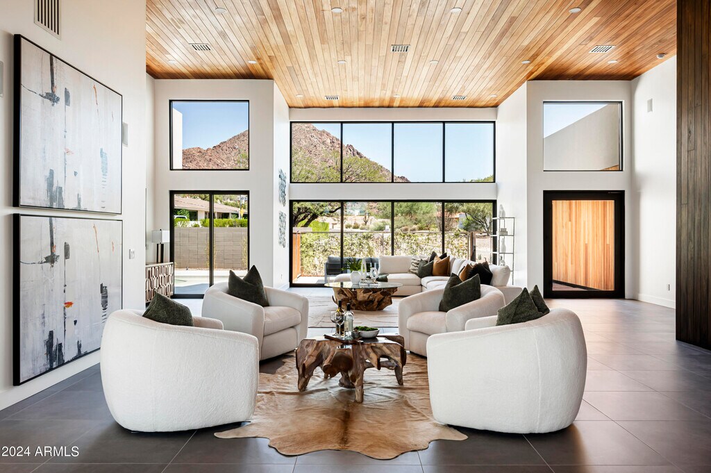 This architectural masterpiece,completed in 2024,with interiors by Joel Contreras Design,offers unparalleled elegance and comfort. This exquisite 5-bedroom,4.5-bathroom estate,boasting 4,496 square feet of luxurious living space on a sprawling 0.56-acre lot and is located in the highly sought-after Hopi school district. The expansive great room with over 2,000 square feet and 16-foot ceilings,seamlessly blends the living,dining,and family areas and features stunning views of Camelback Mountain,creating an inviting atmosphere perfect for entertaining and relaxation. The gourmet kitchen is a chef's dream,featuring Thermador appliances,Vadara Quartz countertops,Shinnoki cabinetry,a 15.5-foot island,and a convenient pot filler. This home is great for entertainers and families.