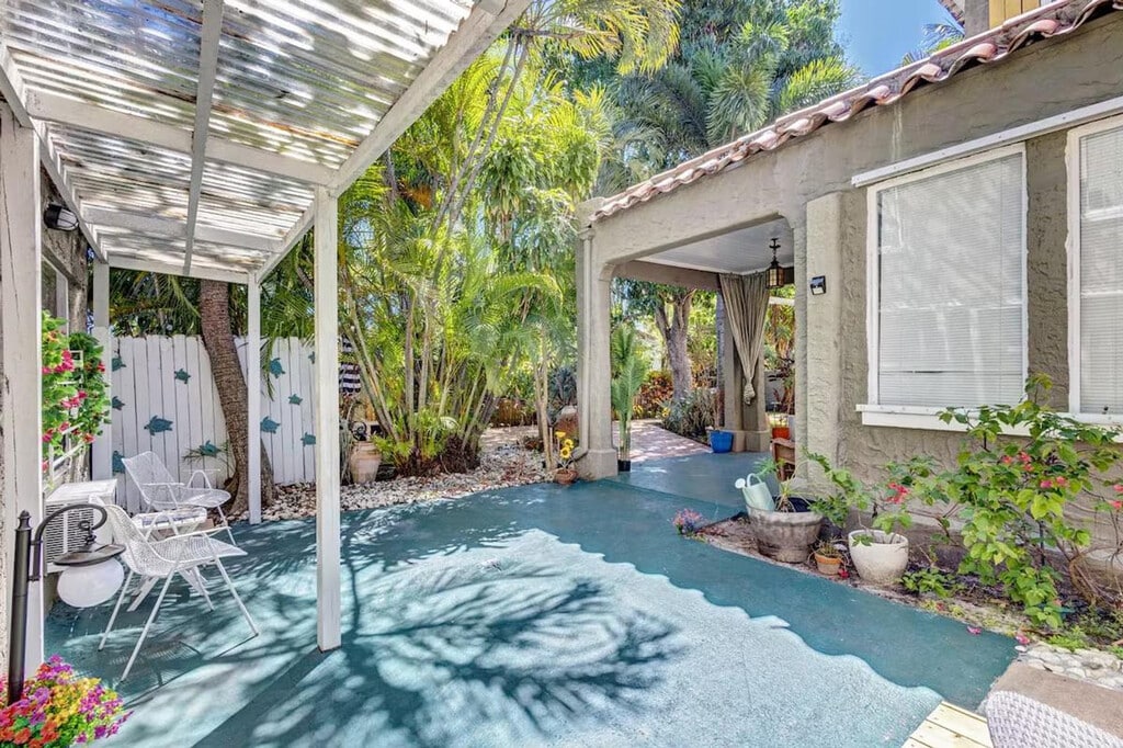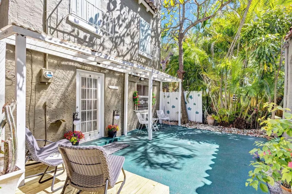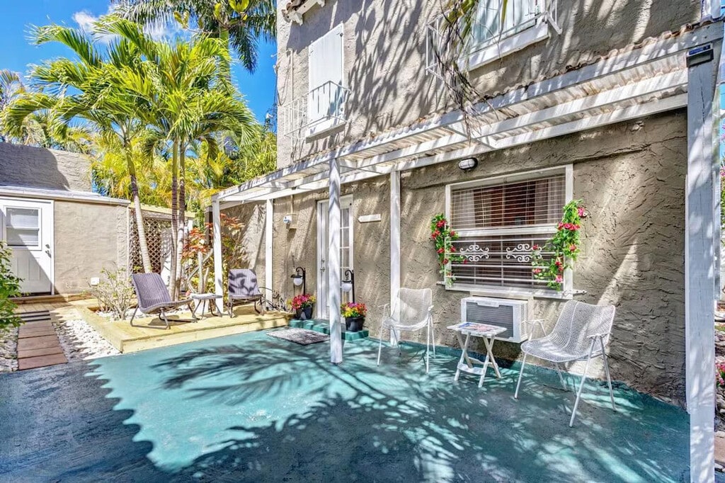 Feel at home in this cozy studio retreat, located just minutes from Palm Beach Island, Palm Beach International Airport (PBI), downtown West Palm Beach, and Nora. This lovely, comfortable ground-level space invites individuals or couples to relax and unwind in enveloping garden scenery, sunlit spaces, and thoughtful details. The studio has all the essentials to make your worries disappear. It features a comfortable bed, a reading nook, a dining counter, and a private outdoor patio area, complete with reclining chairs and a small cafe table. In the courtyard, the spacious grounds, garden, shaded seating areas, laundry area, a heated tank pool, and a barrel sauna are shared with guests from the main home and upper cottage. Access to the shared laundry room is available. As you drift throughout the property, you'll find cozy corners all throughout this outdoor haven. The home is designed with connection to others and nature in mind. Registration Number: 000020057, [SI]