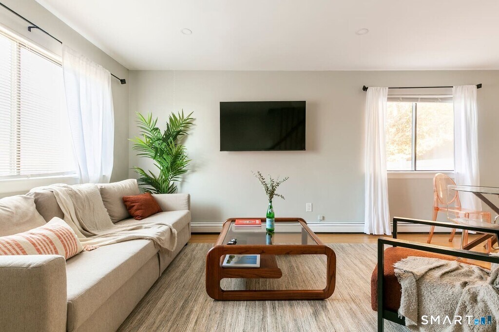 Call for Availability - Fully furnished and recently remodeled, this 3 bedroom, 2 full bath townhouse style home is located in the desirable North End and is move-in ready. This home has 3 floors and comes furnished with furniture, a wall-mounted TV, and more. The main level features a living room with hardwood floors, recessed lighting, and lots of natural light. A full bathroom with a tiled stand-up shower adds convenience. The large eat-in kitchen has been updated with granite countertops, new stainless steel appliances (including a dishwasher), and plenty of cabinet space. From the kitchen, step directly out to the back deck and private side yard. Outside, enjoy a fenced-in side yard finished with crushed stone and pavers-perfect for relaxing or entertaining with added privacy. Upstairs offers three well-sized bedrooms with large closets and a second full bathroom that has been recently renovated. In-unit laundry is conveniently located with additional storage space in the garage. Private driveway for 2 cars. Gas utilities keep monthly costs affordable. Located seconds from I95, Merritt Pkwy, RT25/8 connectors for easy commuting. MLS# 24150503