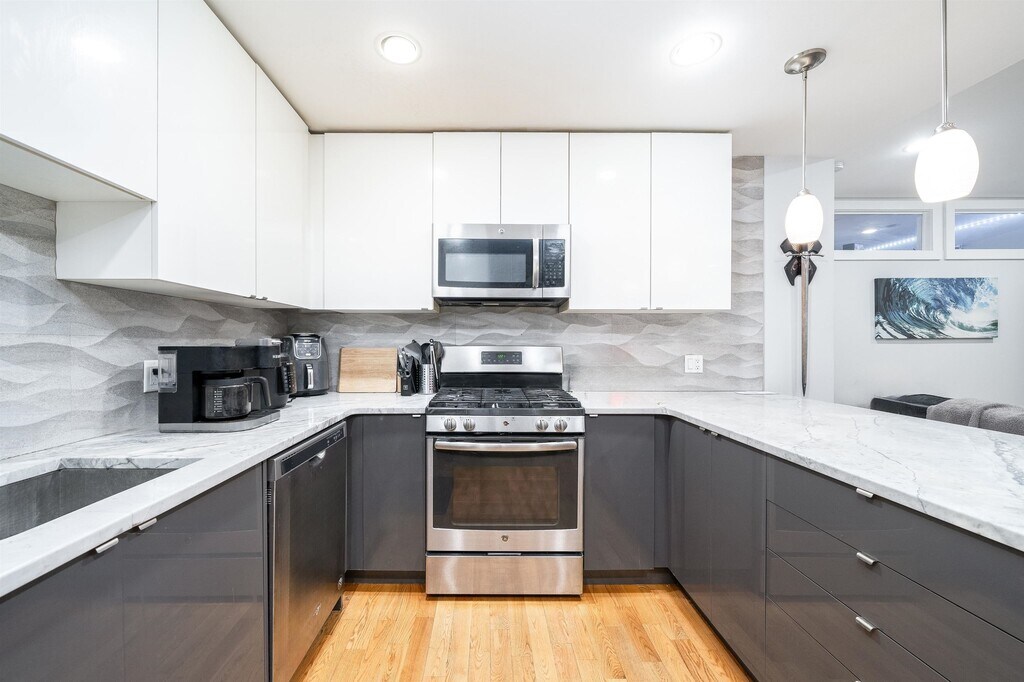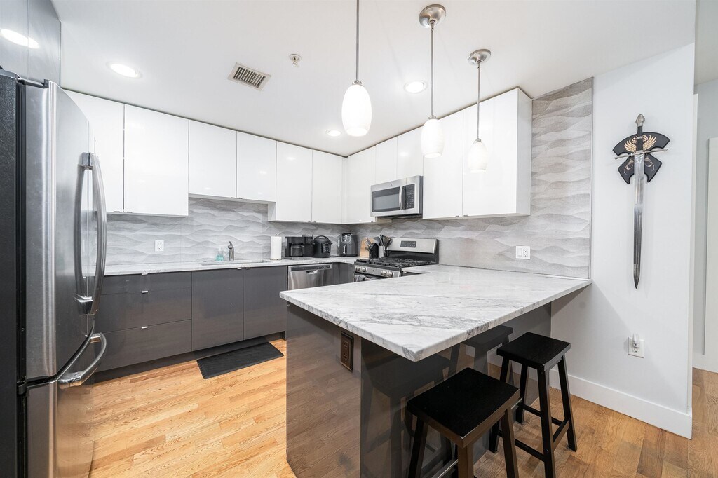 Ultra Modern Apartment featuring 4 bedrooms 2 bathrooms. Stainless steal appliances, hardwood floors, central air and heat, washer/dryer in unit. The kitchen is filled with cabinetry, a tasteful backsplash and gorgeous countertops. All this comes together to make a well rounded home. Close to light rail, bus stops, public parking garage and a quick walk to the Path.