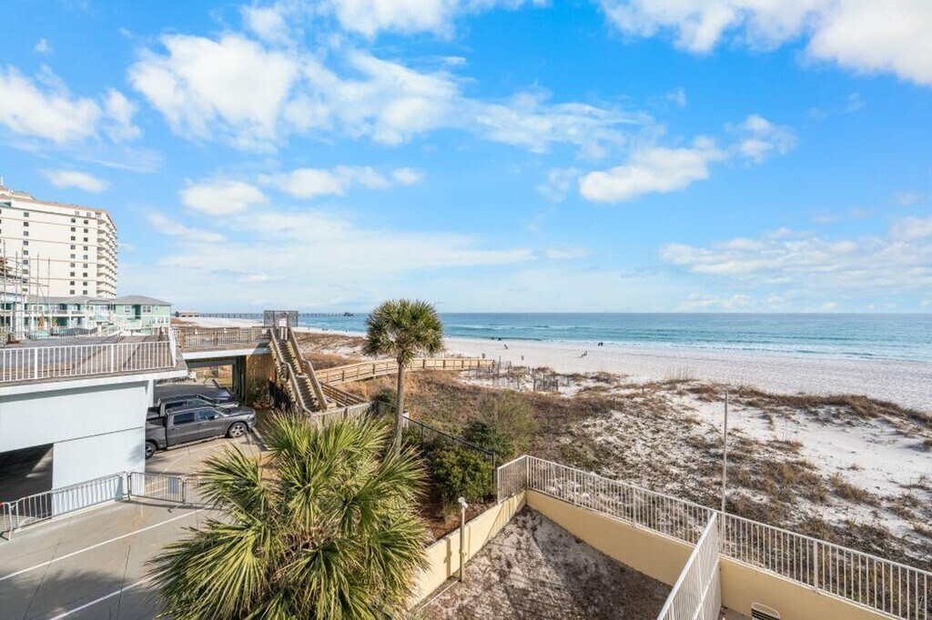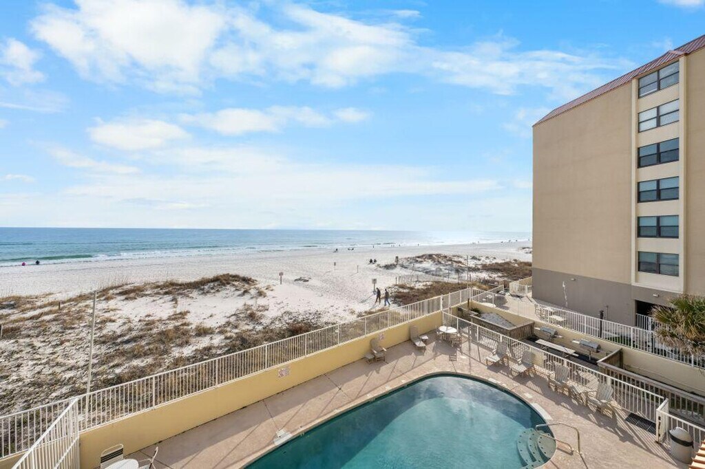 Welcome to Clearwater 2A, a stunning beachfront condo located in the heart of Gulf Shores, Alabama. This beautifully appointed property offers the perfect blend of comfort and convenience, making it an ideal choice for families and groups seeking a memorable coastal getaway. Step inside to discover a spacious living area featuring a comfortable sofa, smart TV, and ample seating, perfect for relaxing after a day at the beach. The fully equipped kitchen boasts modern appliances along with all the kitchenware you need to prepare delicious meals. Enjoy your culinary creations at the dining table or take in the fresh ocean air while dining on the private balcony, complete with outdoor furniture and a grill and BBQ. The condo offers two bedrooms and additional sleeping arrangements with a sofa bed and bunk bed. Clearwater 2A is equipped with essential amenities such as air conditioning, heating, Wi-Fi, cable TV, and a washer and dryer. The building features an elevator for easy access to the condo. Enjoy the shared outdoor pool or take advantage of direct beach access for a day of sun and surf. With breathtaking beach and pool views, Clearwater 2A promises an unforgettable stay in Gulf Shores. Designed with you in mind, this condo features a spacious living area with a comfortable sofa, smart TV, and ample seating, perfect for relaxing after a day at the beach. The fully equipped kitchen boasts modern appliances along with all the kitchenware you need to prepare delicious meals. Enjoy your culinary creations at the dining table or take in the fresh ocean air while dining on the private balcony, complete with outdoor furniture and a grill and BBQ. The parking fee is included in the total amount with a one-car limit. Located in the heart of Gulf Shores, Alabama, Clearwater 2A offers breathtaking beach and pool views. Enjoy the shared outdoor pool or take advantage of direct beach access for a day of sun and surf. Local attractions include Gulf Shores Golf Club, Waterville USA, Alabama Gulf Coast Zoo, Gulf State Park Fishing Pier, and The Wharf, all within a short drive. The condo adheres to enhanced cleaning practices and offers self check-in and check-out for a seamless experience. For March 1st to May 1st, the minimum age requirement for check-in is 25 years old. A traveler must be at least 21 years of age to make a reservation, and a State Identification Card or Driver's License copy will be requested upon booking. There are security cameras installed outside for your safety and protection. No smoking is allowed in the unit or on the balcony, and any violation of the smoking policy will incur a $250 fine plus cleaning costs. Quiet hours are observed from 10 pm to 8 am, with violators charged a $200 fine. No parties or events are allowed, with violators charged a $500 fine. Pets are not allowed. [SI]