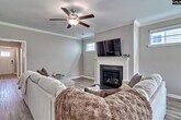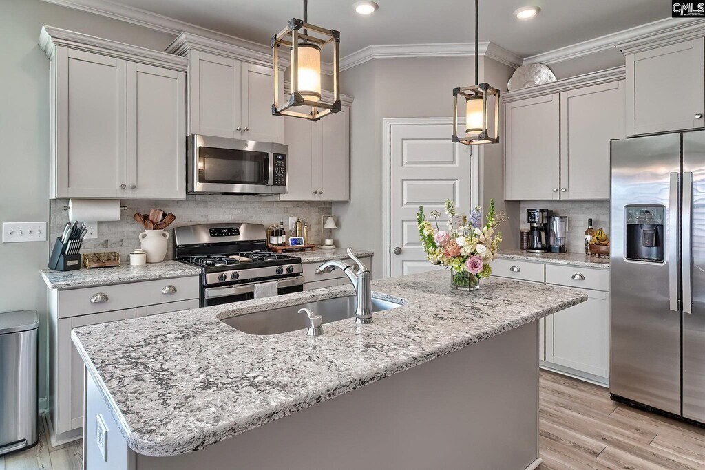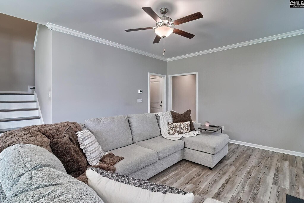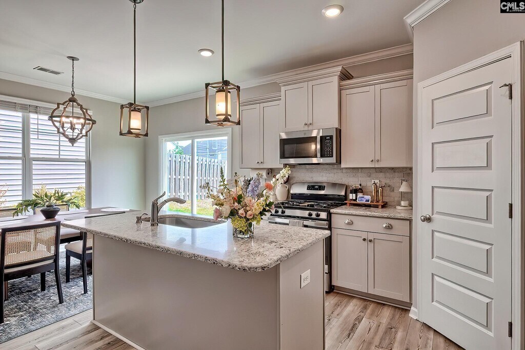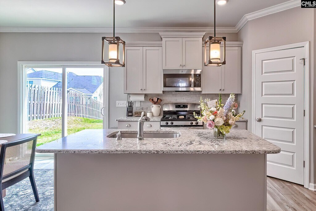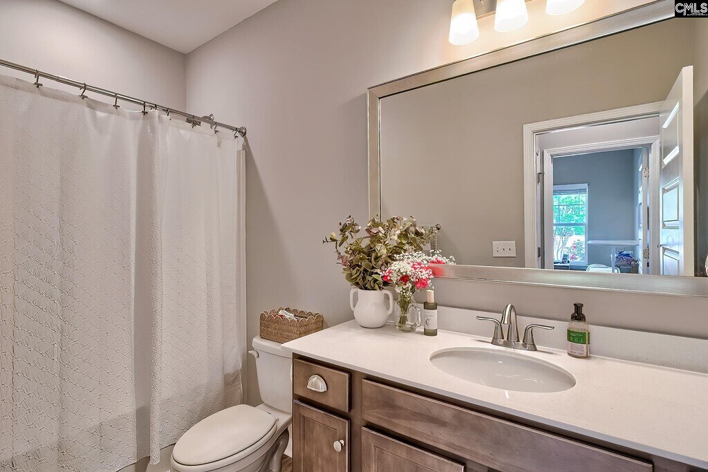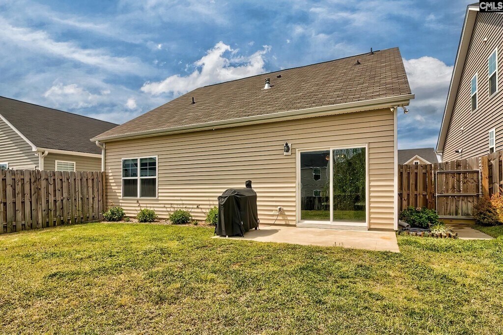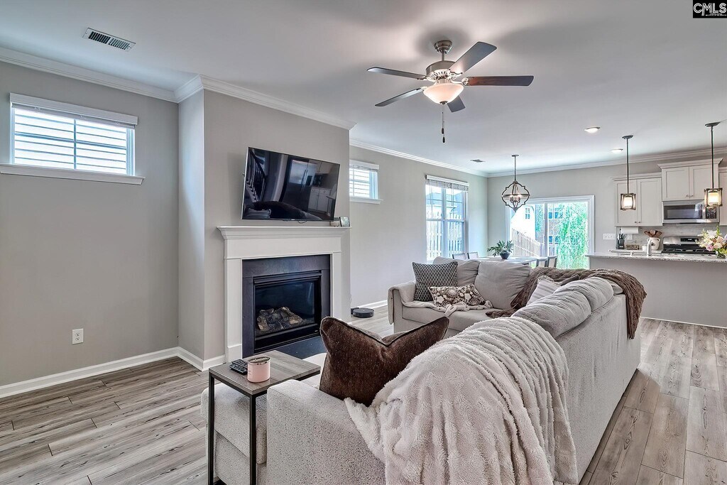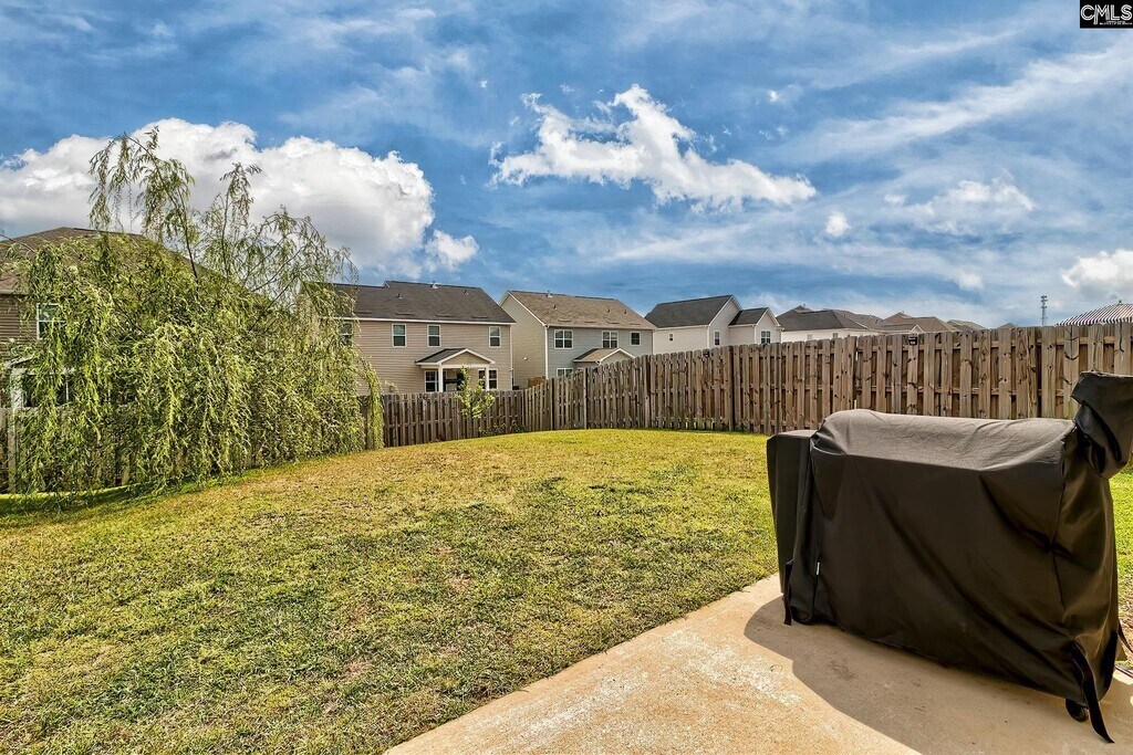 Step into an inviting open-concept layout designed for both comfort and style. The spacious living area features a natural gas fireplace framed by custom molding, creating a warm and elegant focal point. The kitchen is a standout with upgraded cabinetry, granite countertops, a tiled backsplash, stainless steel appliances, a large pantry, and a central island with bar seating—perfect for casual dining or entertaining. The seamless flow between the kitchen, dining, and living spaces makes everyday living effortless and gatherings a breeze. On the main level, a full guest suite offers flexibility for visitors, a home office, or multigenerational living. Upstairs, the primary suite provides a relaxing retreat overlooking the backyard, complete with a boxed ceiling, generous walk-in closet, and a private en-suite bath featuring dual vanities. A third bedroom with its own full bath creates an ideal teen suite or private guest space. Luxury vinyl plank flooring runs throughout the main living areas, complemented by plush carpeting in the bedrooms for added comfort. Step outside to a fully fenced backyard—perfect for relaxing, grilling, or playtime. Enjoy low-maintenance living with HOA-covered front yard care and access to community amenities including a pool, clubhouse, playground, fire pit, and hammock garden. Conveniently located just quick access to I-20, Fort Jackson, and Downtown Columbia, this home offers an exceptional blend of comfort and convenience. Disclaimer: CMLS has MLS ID 631828