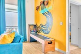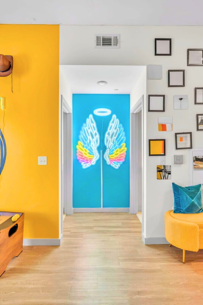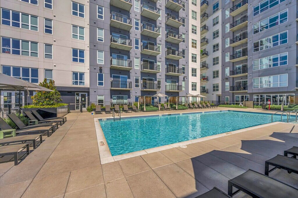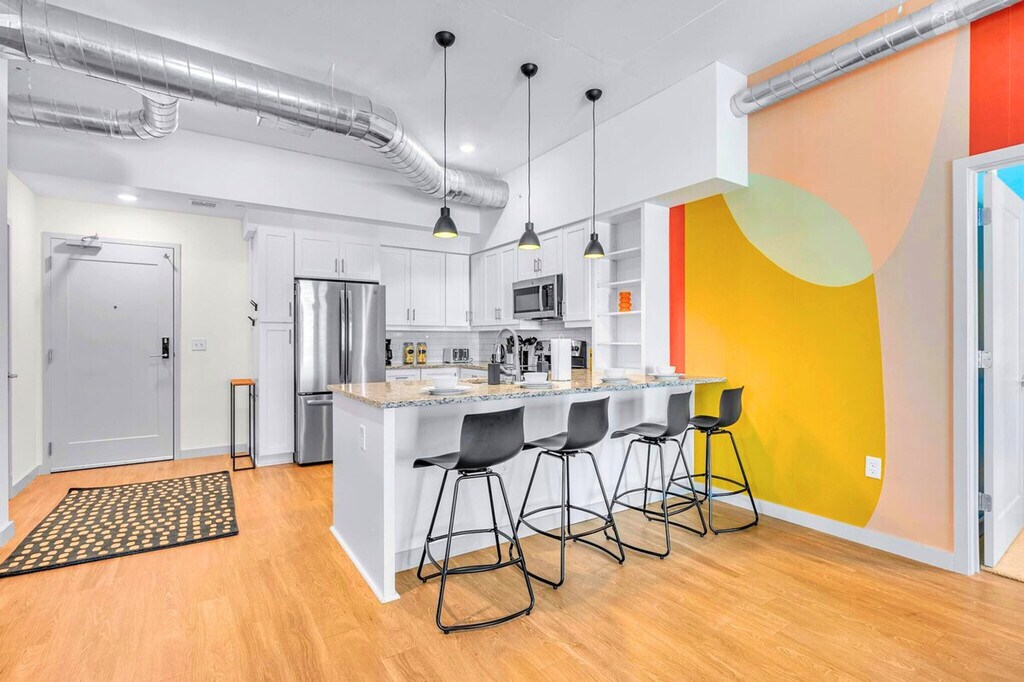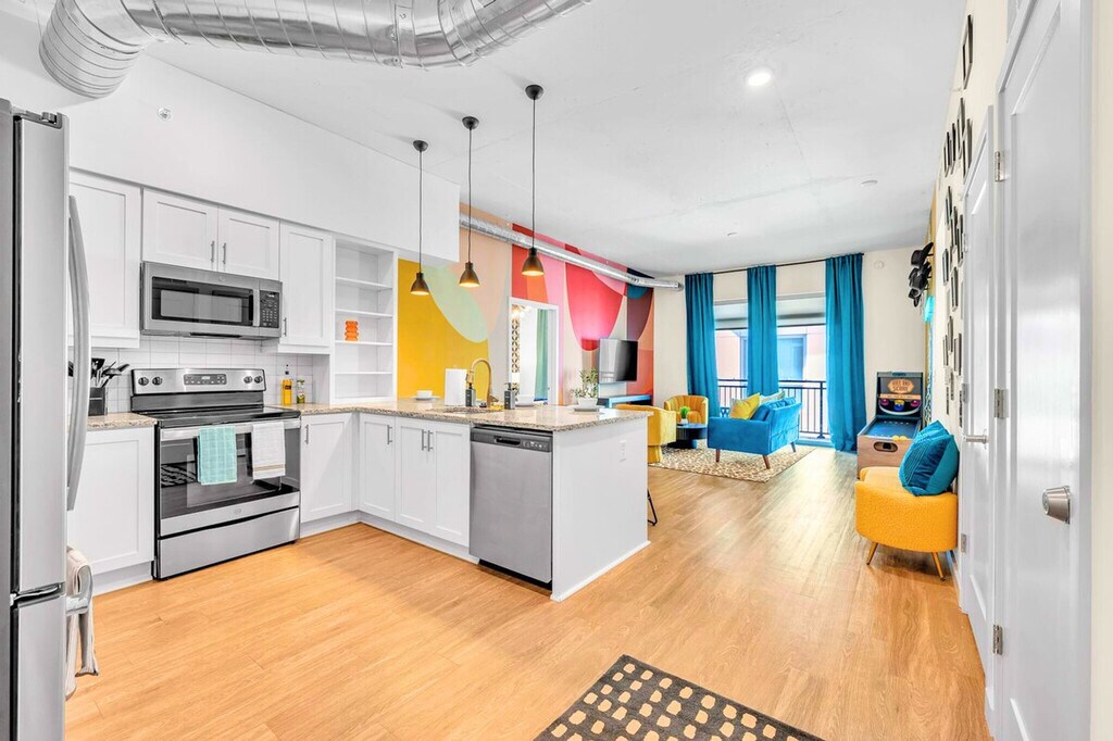 Welcome to the stylish Yee Haw Hangout, the perfect place to kick back during your stay in Nashville. Feel at home in this 2-bedroom suite with a private balcony. This suite features high-end amenities, perfect for entertaining or unwinding. It includes a fully equipped kitchen with kitchen appliances such as a microwave, oven, kettle, coffee maker, cooking and eating utensils. There is also a 55" Smart TV and comfy seating. Guests have access to one parking spot located in the parking garage. Guests must register their vehicle via the Parkade app to be granted free parking. Enjoy luxurious amenities including a rooftop pool, rooftop patio, lounge, and state-of-the-art gym. Located in a well-sought after apartment community, this apartment is a 4-minute drive to Broadway in the heart of downtown Nashville and is within walking distance to tons of bars and restaurants. The pool is open from 8 am-8 pm 7 days a week with the exception of December and January. A starter kit of supplies is provided to make your stay more comfortable, including one bathing towel and one washcloth per guest, two hand towels in the bathroom, body soap, hand soap, shampoo and conditioner, two kitchen towels, three rolls of toilet paper, two rolls of paper towel under the kitchen sink, laundry soap and softener, dish washing soap and dishwasher pods, ground coffee, tea, powdered coffee creamer, sugar, salt, pepper, cooking oil and vinegar. A drip coffee maker (with filters) and a hot water kettle are available for your use in the kitchen. [SI]
