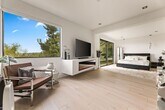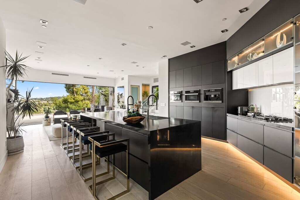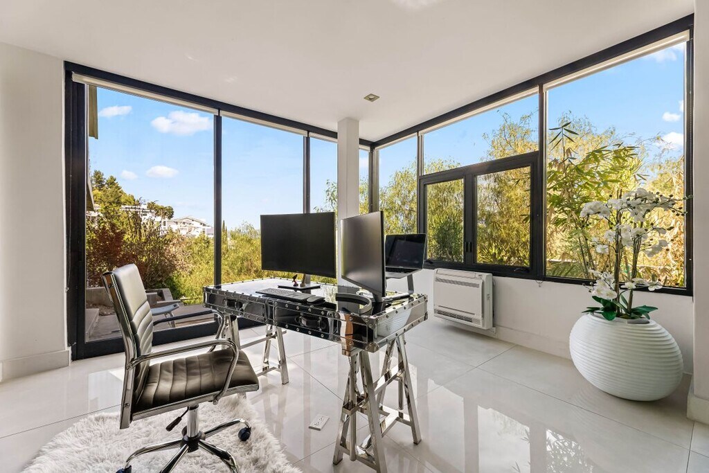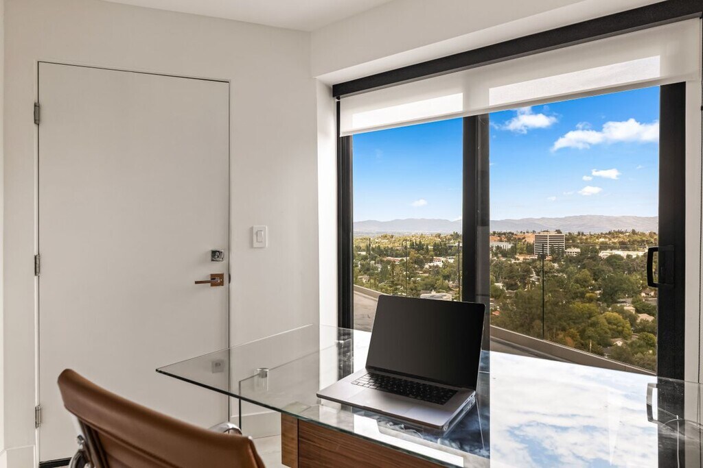 Modern View Estate built for those who crave space, light, style and a view that never gets old. Whether you're waking up to breathtaking sunrises enjoying a fresh espresso from your Miele coffee machine, entertaining guests on the deck, hosting a wine night in the kitchen, or watching films in your personal theatre, every inch of this home speaks to California luxury living. Perched high in the coveted south-of-the-Blvd hills of Woodland Hills, this almost new, 3 year old architectural home combines striking modern design with uninterrupted jetliner views of the entire San Fernando Valley and a location that feels like the Hollywood Hills for half the price. Highlights 1. Chef's Kitchen with premium Miele appliances, wine refrigerator, 12 feet center island, column fridge/freezer combo 2. Open-concept great room with walls of glass and seamless indoor-outdoor living 3. Private home theatre featuring a full 9.1 surround sound system perfect for screening nights 4. Three additional bedrooms, each with en-suite or adjacent bathrooms 5. Two separate office spaces with views ideal for work-from-home or creative studios 6. Designer finishes throughout: wide-plank floors, custom cabinetry, recessed lighting, and high ceilings 7. Expansive view decks offering breathtaking sunrises and sunsets 8. Quiet hillside street with ultimate privacy 9. Attached garage with direct access 10. Smart home features, central HVAC, and tankless water heater 11. Just minutes to Ventura Blvd, Topanga Social, The Commons, Whole Foods, and 101 freeway access 1 year lease but short-term options are available. Unit is listed as unfurnished but call for if you want the furniture, Tenant pays all utilities.