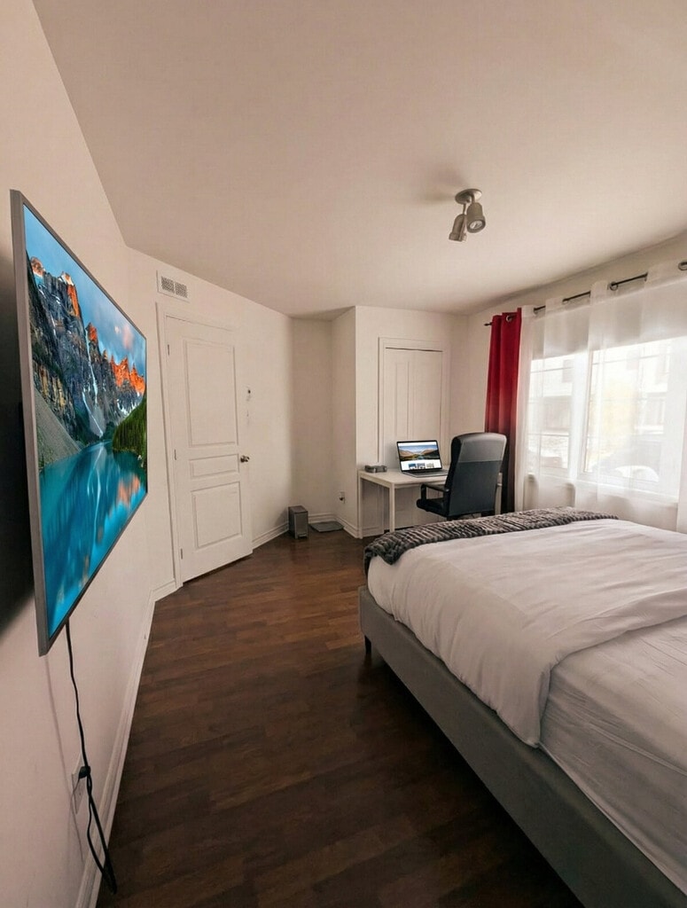 The advertised rate of C$7,704/month is the lowest available price, based on a 1 month(s) stay with a move-in date of June 8, 2026. Rates vary depending on the duration of stay, season, and other parameters. For exact pricing and additional pricing components, please visit our website and enter your desired move-in and move-out dates. The rate is applicable when billed upfront; it can be higher if billed in multiple payments. Experience a rare blend of ultimate convenience and private luxury in this modern 1-bedroom condo, your personal oasis perfect for a relaxing getaway, a productive business trip, or a high-end home base. Feel at home in this stylish retreat, featuring a private entrance to the side of the property, ensuring a peaceful and undisturbed stay. Every detail of this condo has been thoughtfully designed with a modern, elegant, and luxurious touch. Unwind in the chic living room on the plush sofa, and stream your favorite shows on the large Smart TV. The sleek, fully equipped kitchen features high-end appliances and a Keurig coffee machine with pods included. Your serene retreat awaits in the private bedroom, complete with a comfortable queen bed and its own second Smart TV for late-night viewing. Step out onto your expansive private balcony to enjoy your morning coffee or an evening cocktail. The ultimate luxury is the private, all-season hot tub, available exclusively for your use. Enjoy the extraordinary convenience of two free, dedicated parking spaces. Perfectly situated just 15 minutes from Montréal-Trudeau International Airport (YUL), this property offers unparalleled access and a productive environment. The fireplace is a decorative piece and not usable due to the potential risks. Includes a dedicated workspace and high-speed Wi-Fi, perfect for remote work or catching up on emails. [SI]