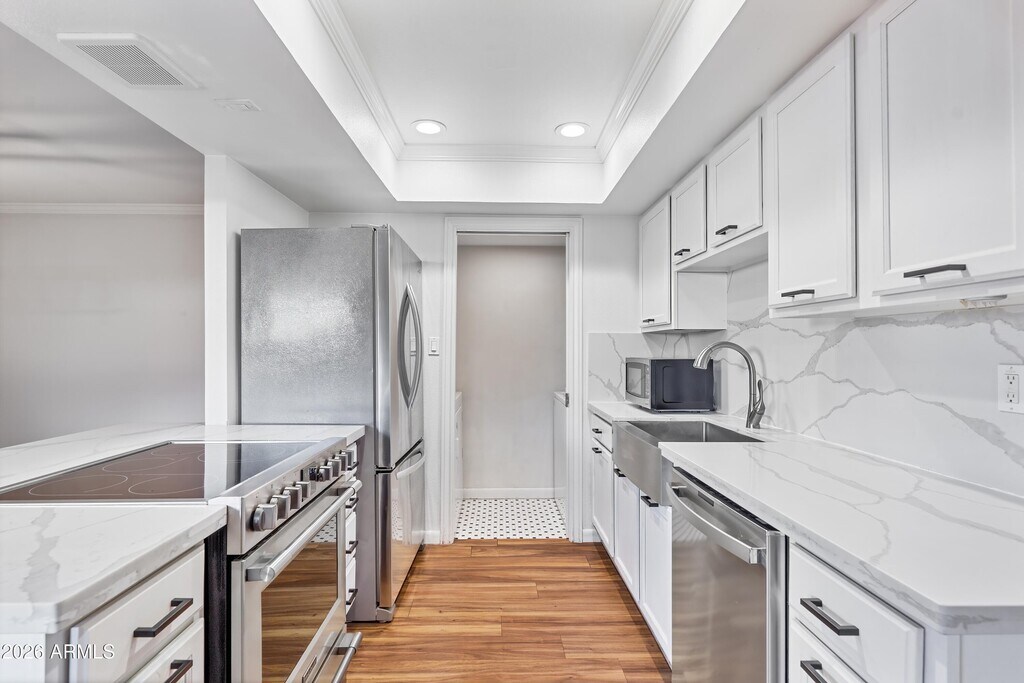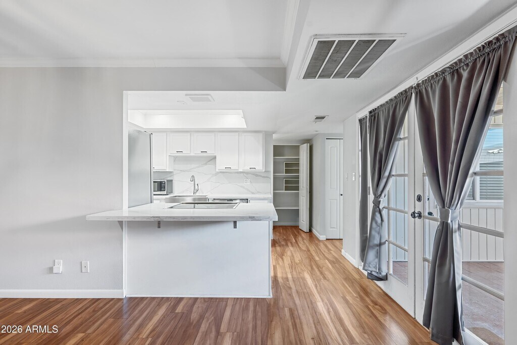 Available April 1! Effortless single-level living in the heart of Old Town Scottsdale. This beautifully updated 2-bedroom,2-bath split floorplan townhome features hardwood flooring throughout and elegant French doors,all just steps from Chaparral Park.The kitchen is crisp and modern with white cabinetry,quartz countertops,stainless steel appliances,upgraded lighting,and RO water filtration. The expansive owner's suite offers a brand-new spa-inspired bath with a walk-in rain shower and TWO walk-in closets. The second bedroom is well-sized with a fully remodeled guest bath; ideal for guests,a roommate,or a refined home office.Enjoy a large private covered patio,two covered carport spaces,and an additional storage unit.
