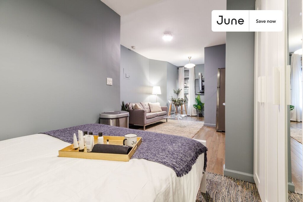 Studio in East Village on flexible lease terms. This studio is available on a 12 month lease or a flexible short term (31 to 364 days) lease. You pick your custom start and end date. Monthly rent rate is determined by furnishing preference, move-in date and move-out date. Speak to a June representative for recommendations on the best stay duration for the lowest rate. Amenities of this home: Wi-Fi - Paid separately (High-Speed), Guarantors Allowed, 32-inch Flat-Screen TV, Dining area, Couple-Friendly, North facing, Full bed, Smart lock, Hardwood Flooring, Microwave, Oven, Refrigerator, also, this unit is conveniently located, several local parks, restaurants and bars are just minutes away. About June Homes: Welcome to the easiest rental experience of your life. Rent furnished or unfurnished apartments on a 12 month lease or a flexible short term (31 to 364 days). As a resident, you’ll have access to 24/7 support and monthly cleanings of the home’s shared spaces. Sign up now to apply online for your next home with June. Brokers welcome! Contact us for more details. Speak to a June representative for recommendations on the best stay duration for the lowest rate, and learn more about this home on the June website. Use this listing ID when speaking to June team: #351