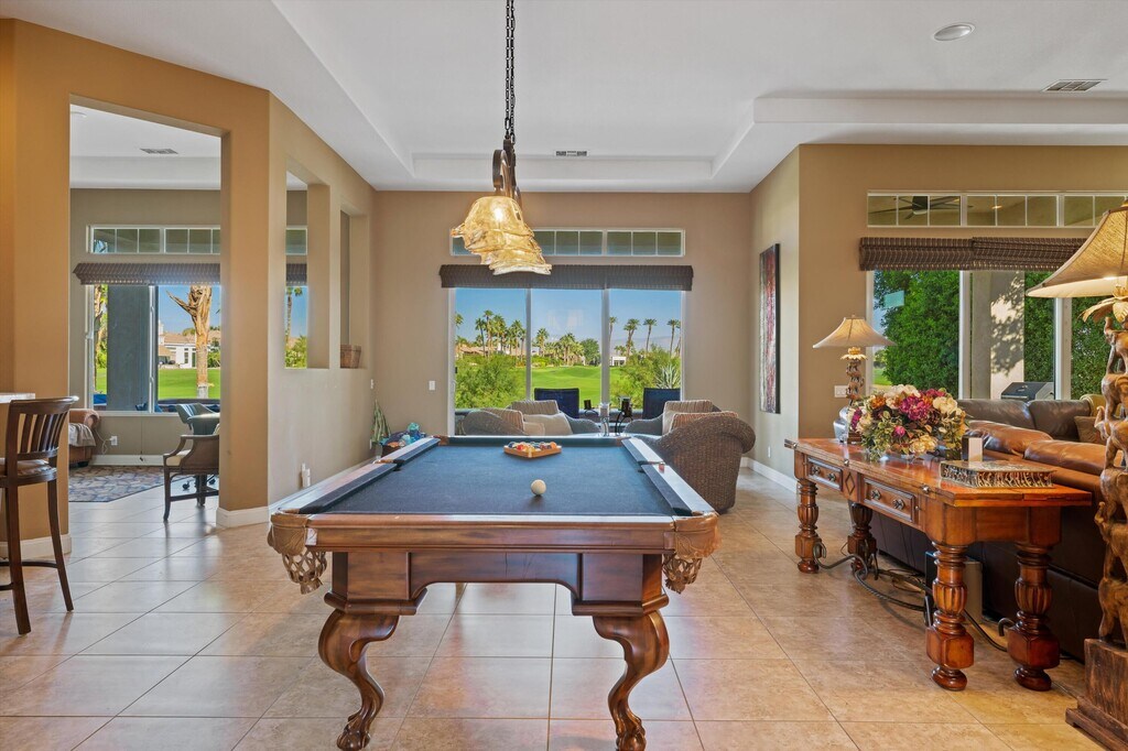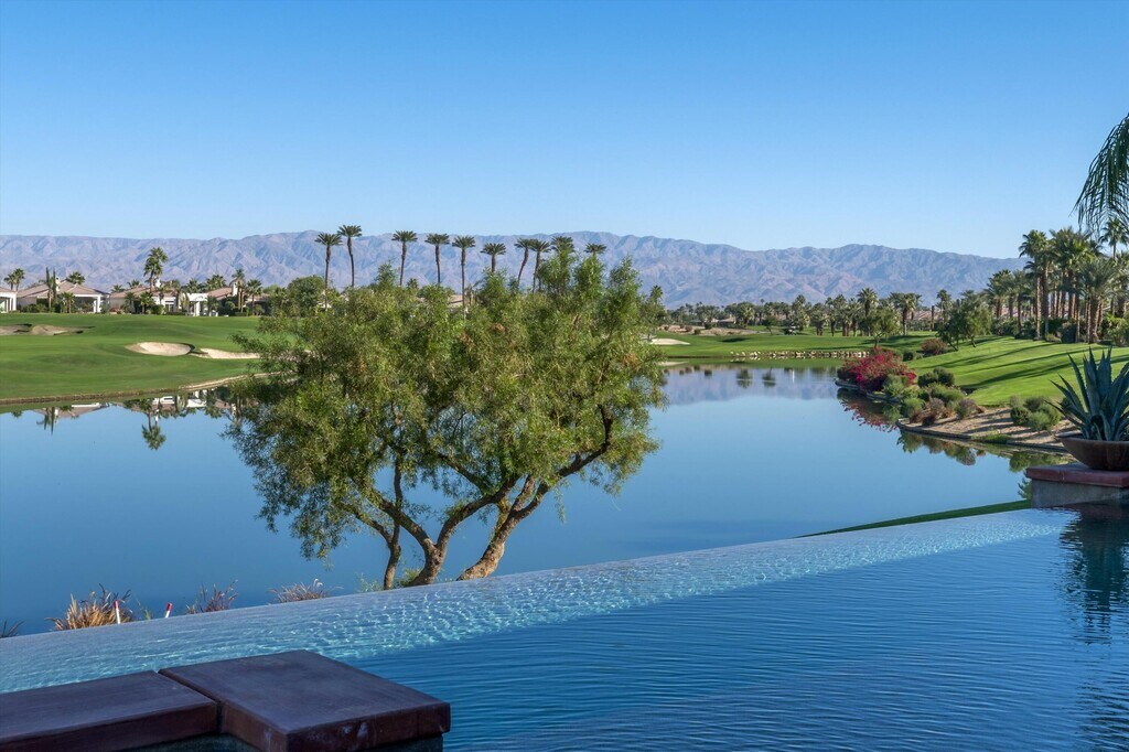 Owners using home last two weeks of April 2026. This 4BR/4.5BA (Including Casita) turnkey furnished home is situated on the 15th Fairway of Mountain View CC in La Quinta. With spectacular lake front mountain views,this beautiful property offers tenant all of the social amenities of the club,including access to pickle ball,tennis,bocce ball,fitness center and classes,heated community pool/spa,spa services and active social calendar of events,with tenant only paying a one time $750 social membership transfer fee. Well stocked kitchen with stainless appliances and dining area has adjacent formal dining room,living room with fireplace and wet bar and office,all with view of backyard pool and VIEW! Master bedroom suite has king bed,and bath with separate tub and shower,dual vanities,and big walk in closet. Two secondary bedrooms have ensuite baths,as does the casita. All bedrooms have smart TVs. Backyard patio has big sparkling infinity pool/spa,fire pit,dining table and patio furniture. Laundry room and attached 3 car garage rounds out the floor plan. Owner pays for HOA dues,and provides cable,internet,and all utilities,with $400 MO cap for combined gas/electric. $7000 security deposit. $500 cleaning fee. Dog allowed,with owner approval of dog and additional $500 pet deposit. $12,500 May. $15,000 MO Nov-April. Summer rates negotiable. No showings when tenant occupied. Photos are current.