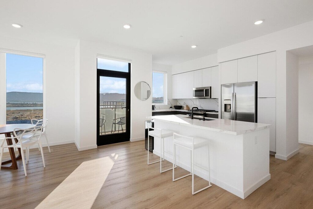 Top-floor corner 2BD/2BA penthouse in Lennars premier Madison Collection at The Shipyard, offering 1,109 sq. ft. of modern living with sweeping Bay, Candlestick Point, and San Bruno Hills views. Expansive windows fill the home with natural light and showcase stunning sky and water views. The open-concept living, dining, and kitchen areas are ideal for everyday living and entertaining. The chef's kitchen features GE stainless steel appliances, Silestone quartz countertops, Bianca Calcutta backsplash, and a large center island. A private balcony is perfect for morning coffee or sunset views. Bedrooms are positioned on opposite sides for privacy. The primary suite includes a custom walk-in closet and spa-inspired en-suite bath, while the second bedroom works well as a guest room or home office. Additional features include hardwood floors, high ceilings, central A/C and heating, custom electric window treatments, built-in closets, in-unit washer/dryer, and secured garage parking with EV outlet. Community amenities include a resident lounge, fitness center, landscaped courtyard with BBQ area, dog wash, bike storage, and elevator access. Prime Hunters Point, Bayview location near parks, trails, Dogpatch, Mission Bay, UCSF, and easy access to Hwy 101 & 280, downtown SF, and SFO. MLS # ML82032922