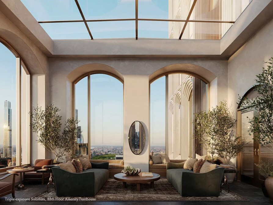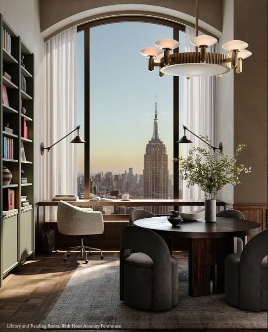 This northeast corner one-bedroom residence at 520 Fifth Avenue spans 808 square feet and offers iconic views of Fifth Avenue, including the Chrysler Building and One Vanderbilt. Four soaring 10' x 10' arched windows bathe the home in natural light, highlighting a thoughtful layout with an entry foyer, open chef’s kitchen, primary bedroom with en-suite four-fixture bath, powder room, and in-unit washer/dryer. Rising 1,000 feet, 520 Fifth Avenue is the tallest residential tower on Fifth Avenue, offering sweeping skyline views from Central Park to the Empire State Building. Designed by Kohn Pedersen Fox Associates and curated by AD100 designer Vicky Charles of Charles & Co, residences feature 7-inch-wide oak floors, sculptural millwork, fully vented kitchens with Miele appliances, and luxurious bathrooms with Calacatta Lincoln and Laguna Verde marble. The 88th-floor Penthouse Amenity Suite offers 360-degree views, a solarium, lounge, dining room, library, and billiards/game room, while