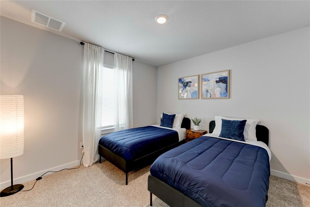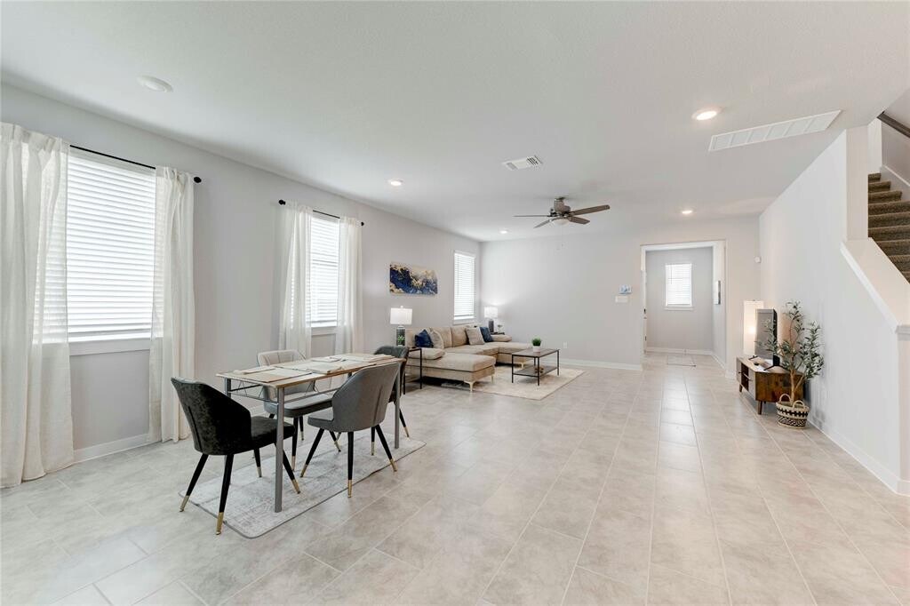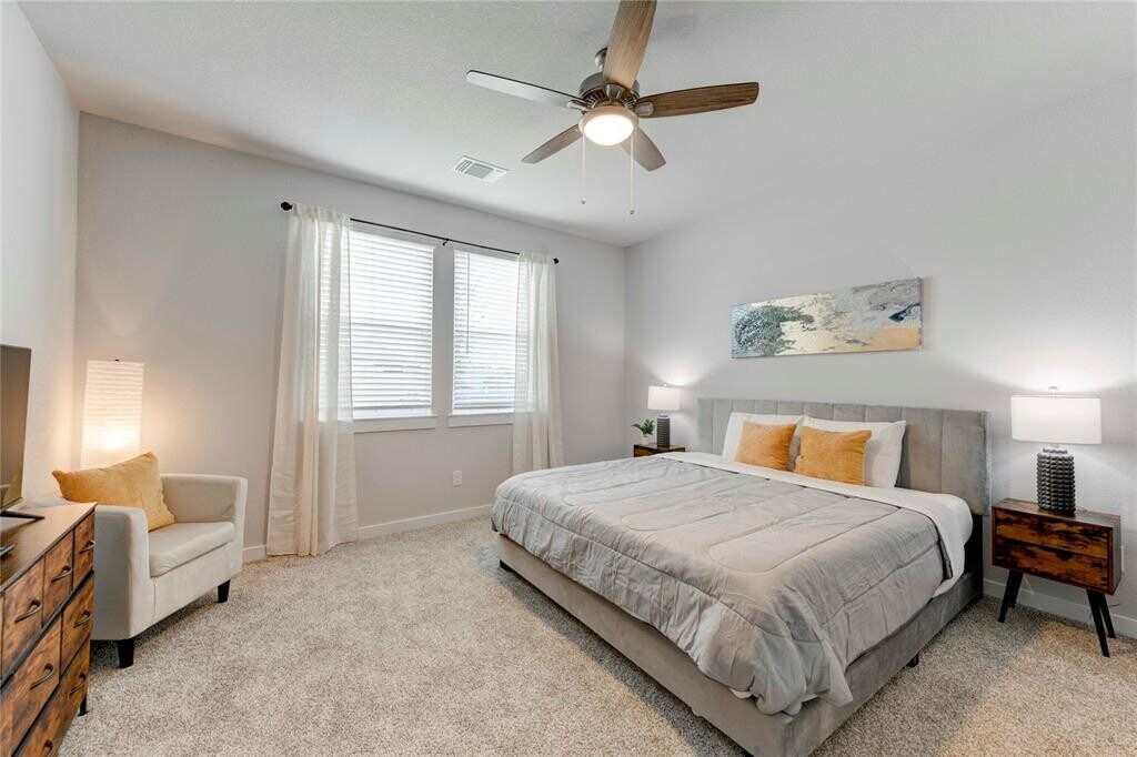 This stunning, fully furnished 2-story home offers approximately 2,232 sq ft of beautifully designed living space. With 4 spacious bedrooms (3 located downstairs and 1 private upstairs), and 3 full bathrooms, this home is perfect for both family living and entertaining. The upstairs features a secluded retreat, complete with a bedroom, full bathroom, and a dedicated game room—ideal for guests, teenagers, or a quiet home office. The open-concept layout includes a cozy living area, while the game room provides additional space for recreation and relaxation. Step outside to the covered patio, an inviting spot for outdoor dining or simply unwinding after a long day. The fenced-in backyard ensures privacy and security, making it the perfect space for kids, pets, or outdoor gatherings. Completing the package is a 2-car attached garage for added convenience. Whether you're hosting a gathering or enjoying a peaceful evening, this home is the ideal setting for it all!