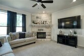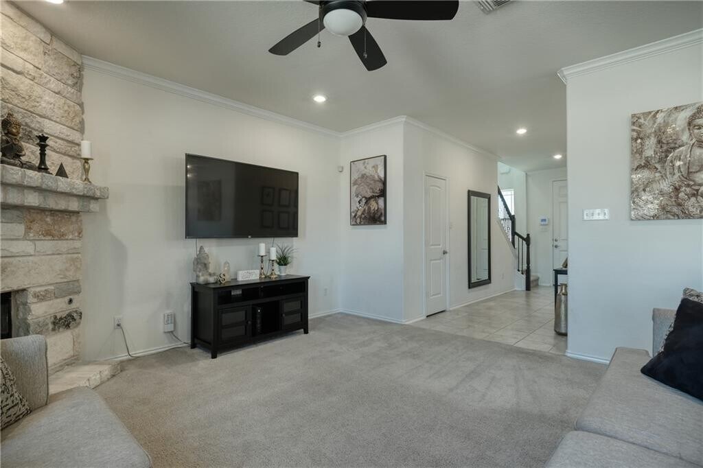 This 2017-built, 2,431 sq ft home in Hutto offers 3 bedrooms and 2.5 bathrooms with an attached 2-car garage and a well-designed open floor plan. The spacious living room features a fireplace and ceiling fan and flows seamlessly into the kitchen, which is finished with dark cabinets and polished granite counter tops and comes fully equipped with a microwave, cooking range, refrigerator, oven, and dishwasher. Flooring throughout the home is a combination of tile in the entry, kitchen, and bathrooms, and carpet in the living areas and bedrooms. The staircase near the entry has carpeted steps with a dark wood handrail and black wrought-iron balusters, adding a modern touch. Bathrooms include a double vanity and a standard bathtub with shower combo, not a soaking tub, along with tiled surrounds. The laundry room is equipped with a washer and dryer, and the primary bedroom offers a walk-in closet. Outdoors, the home features a covered patio and a fully fenced, landscaped backyard, making it ideal for outdoor enjoyment. The community also offers desirable amenities such as a children’s playground and a community swimming pool, providing great options for recreation and relaxation. MLS ID 9249060
