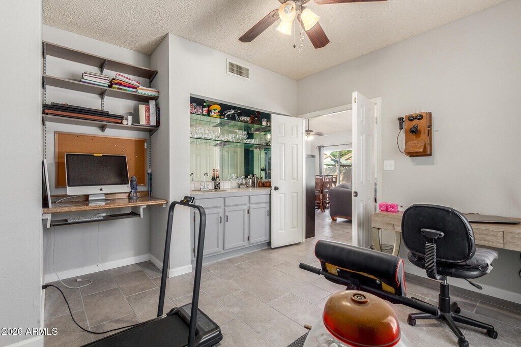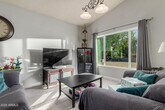 Charming 3-bedroom + den,2-bath home on a cul-de-sac lot with a pool and an open,airy layout. No carpet in the living spaces,plus an updated kitchen and bathrooms for a clean,modern feel. The living room features soaring ceilings,while the family room and kitchen offer vaulted ceilings and a cozy brick fireplace. The den includes a wet bar,ideal for entertaining or a home office. Ceiling fans throughout. Spacious backyard with a large covered patio and direct access from the primary bedroom and family room. Built-in garage storage provides extra functionality.