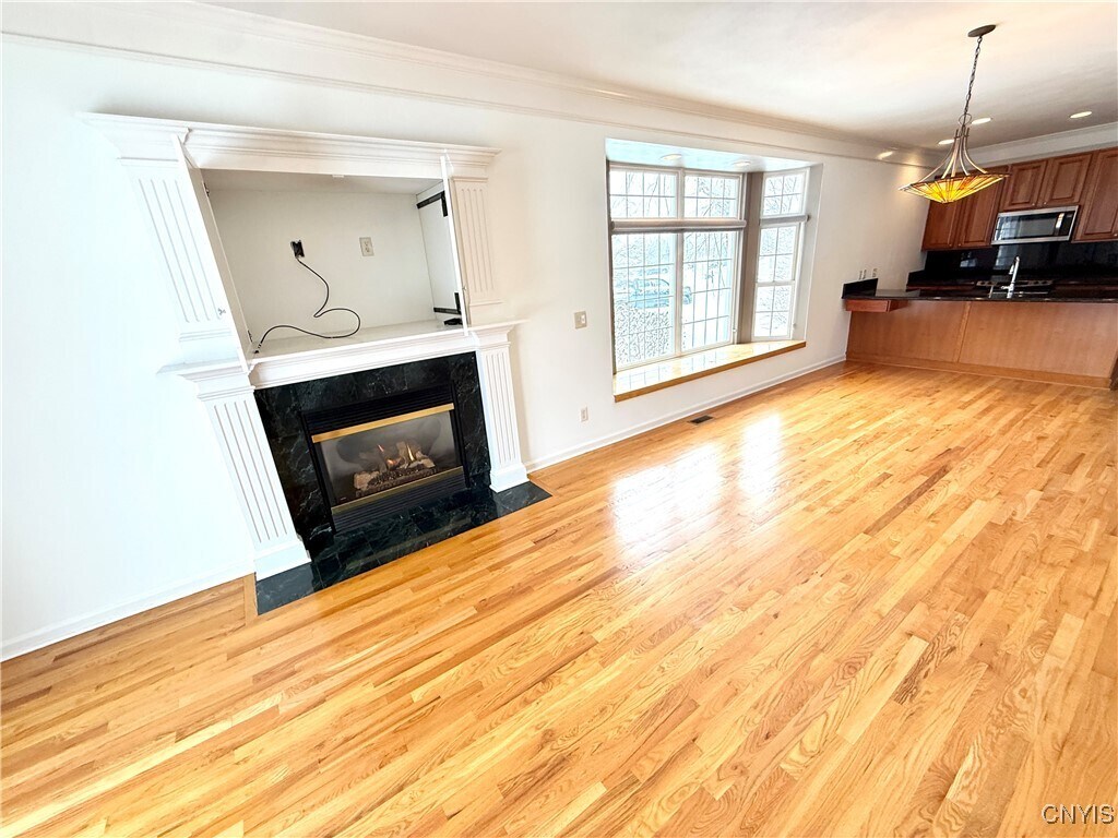 Rare opportunity to rent a property in this condition and location. Exceptional end-unit patio home in the highly sought-after Pointe East community,ideally located on a quiet cul-de-sac and backing to the golf course. This light-filled home features an inviting open floor plan with high ceilings and gleaming hardwood floors throughout the main living areas. A side-lit front door opens to a bright foyer,where abundant windows flood the space with natural light. The kitchen offers a breakfast-bar island,an exceptionally large pantry,and a charming bay-window eat-in area,along with a conveniently located laundry room. The spacious great room showcases a gas fireplace and sliding glass doors that lead to a private deck—ideal for relaxing or entertaining. Enjoy easy one-floor living with two generously sized bedrooms and two full baths,including a primary suite with a heated walk-in closet and ensuite bath. A two-car garage with a ramp provides added convenience and accessibility. The partially finished lower level ( approx. 700 sq ft) adds versatile living space perfect for a recreation room or home office,with ample storage and room for future expansion. Ideally situated near shopping,universities,hospitals,and major highways. Jamesville-DeWitt Schools. A perfect blend of comfort,convenience,and lifestyle. Rentals in this condition and location don’t come around often. Please fill out rental application before your tour.