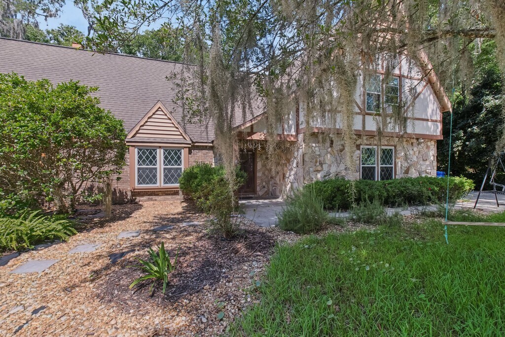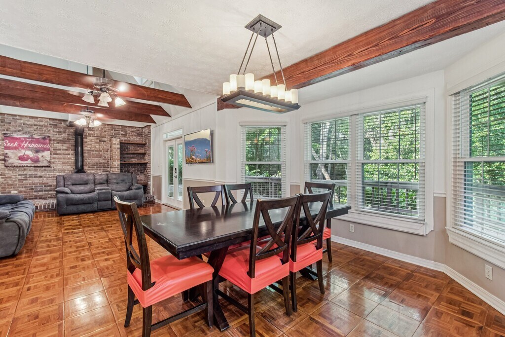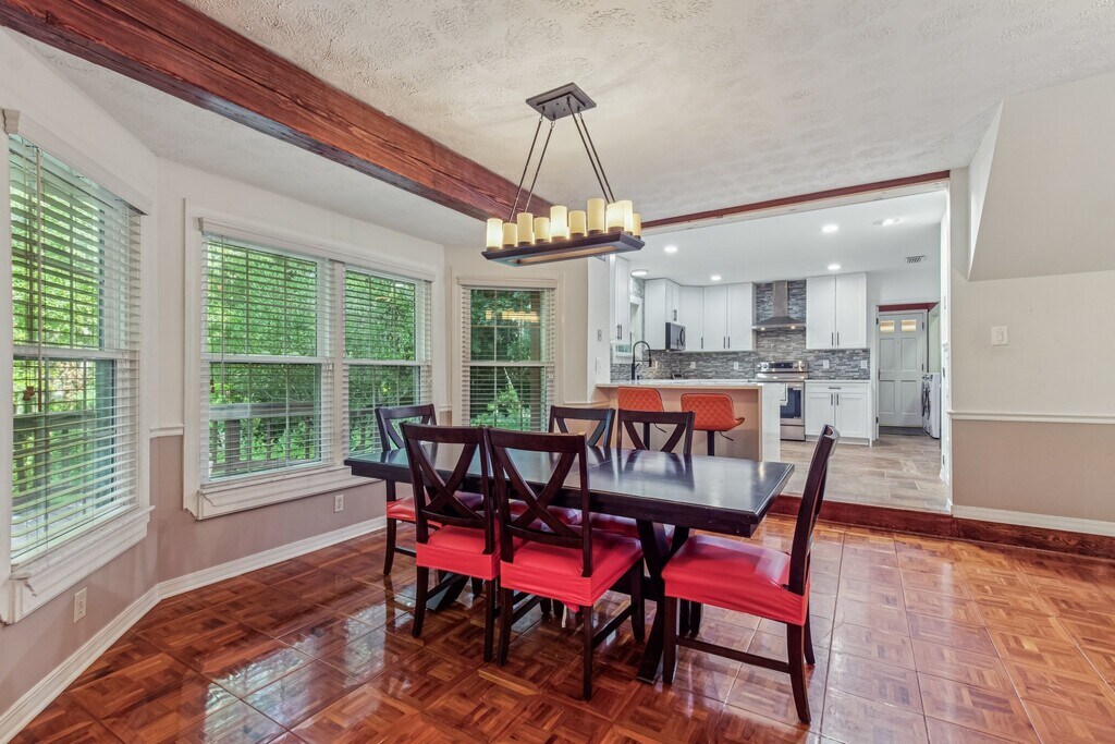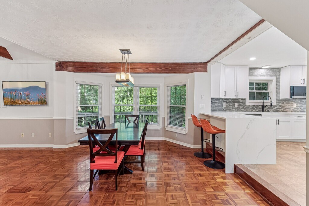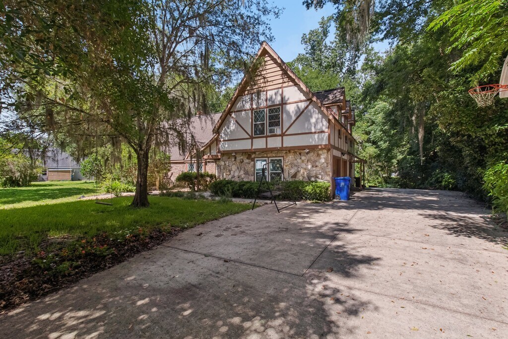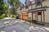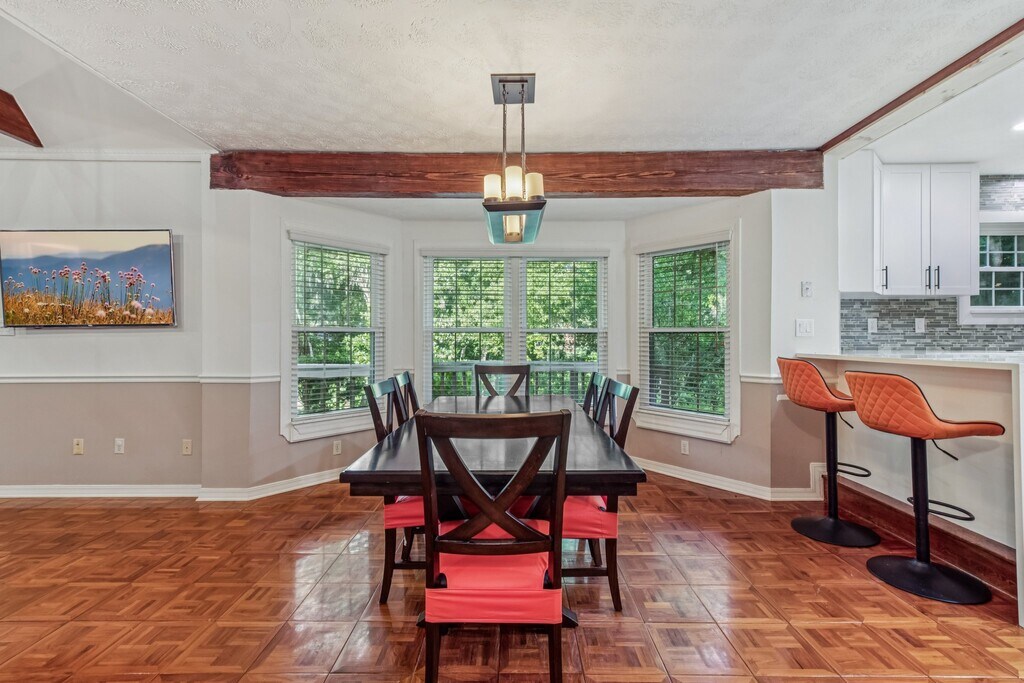 Step into timeless charm with this Tudor-style 4-5 BR, 2.5BA home, perfectly positioned on a spacious lot that backs up to a serene wooded stream. The home's warmth shines through with rich wood beams, custom woodwork, and hand-crafted bookshelves nestled in the cozy upstairs loft. Enjoy the peaceful views from the deck, accessed through elegant French doors off the living space. The remodeled kitchen is a chef's dream, featuring quartz countertops, a statement stainless steel hood, and a large sink framed by a window overlooking nature. The primary suite is a true retreat—set apart from the other bedrooms for privacy—with its own French doors opening to a private balcony, double vanities, barn doors, and a luxurious rain shower in the ensuite bath. From the lofty ceilings to the tranquil outdoor setting, this home offers character, craftsmanship, and comfort in every corner.