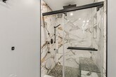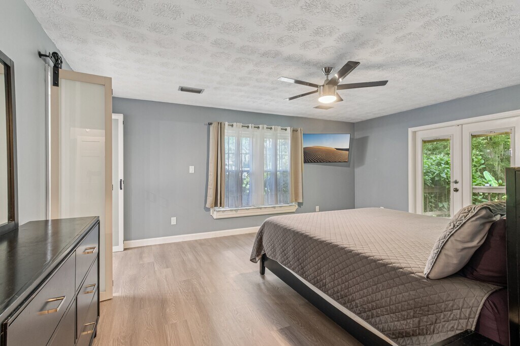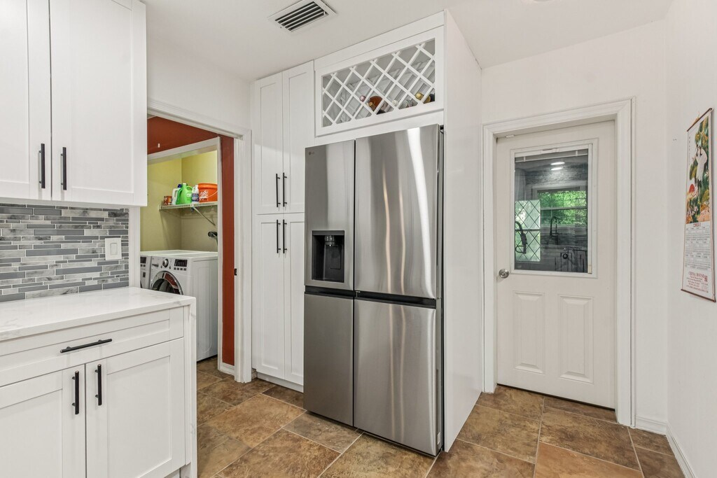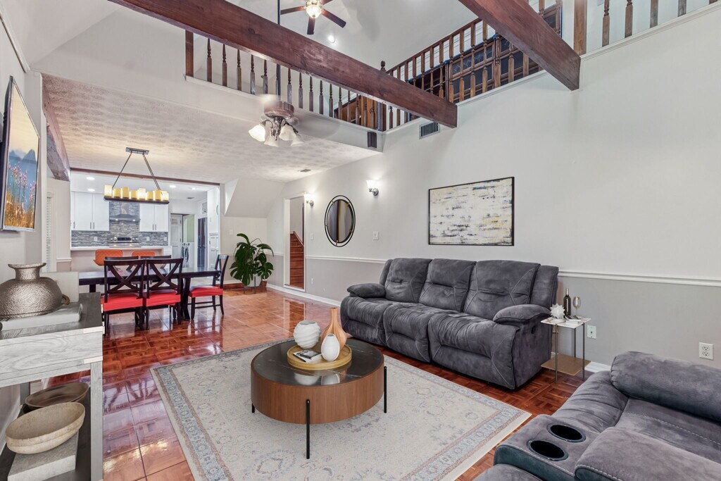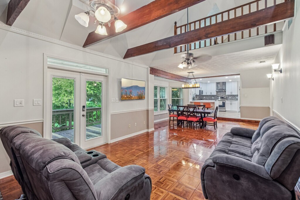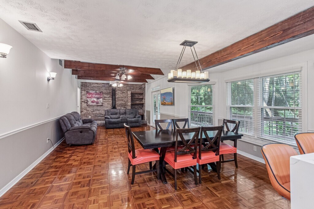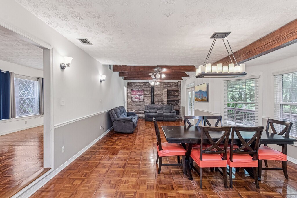 Step into timeless charm with this Tudor-style 4-5 BR, 2.5BA home, perfectly positioned on a spacious lot that backs up to a serene wooded stream. The home's warmth shines through with rich wood beams, custom woodwork, and hand-crafted bookshelves nestled in the cozy upstairs loft. Enjoy the peaceful views from the deck, accessed through elegant French doors off the living space. The remodeled kitchen is a chef's dream, featuring quartz countertops, a statement stainless steel hood, and a large sink framed by a window overlooking nature. The primary suite is a true retreat—set apart from the other bedrooms for privacy—with its own French doors opening to a private balcony, double vanities, barn doors, and a luxurious rain shower in the ensuite bath. From the lofty ceilings to the tranquil outdoor setting, this home offers character, craftsmanship, and comfort in every corner.