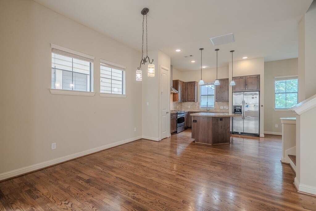 Gorgeous 3 Bed 3.5 bath home in upscale Rice military,well maintained. The second floor features an open concept hardwood flooring living area,gourmet island kitchen with granite countertops,and stainless appliances. A spacious guest bedroom on the first floor with private Bath and walking closet. A large master suite on the 3rd floor with a huge primary bath and closet,plus the third bedroom with a private bath. Stone and stucco front unit with a charming gated backyard area outside. Easy access to major highways,minutes to downtown,memorial park and Galleria. This is a must-see. Please verify independently. Come see it quickly! MLS# 19731929