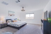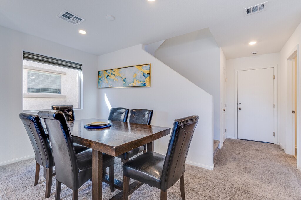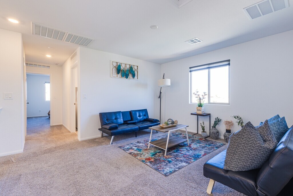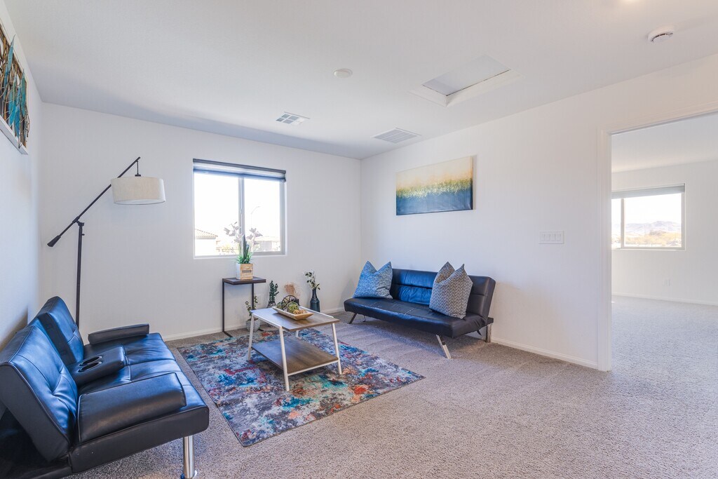 Turn-key furnished home at the end of a cul-de-sac in desirable Linmar Ranch! This 3-bedroom + loft residence offers 1,820 sq ft of bright, open living space and sits adjacent to a community park with no rear or direct neighbor to the east. Modern kitchen with stainless appliances and island seating flows seamlessly into dining and living areas. Upstairs loft provides flexible space for media room or office. Spacious primary suite, well-appointed secondary bedrooms, upstairs laundry, and two-car garage. Attractive paver driveway adds curb appeal. Linmar Ranch offers three parks and a dog park with convenient freeway, airport, and Strip access. Pets considered on a case-by-case basis. Approved applicants must commence lease within 13 days. Move-in ready and professionally managed.