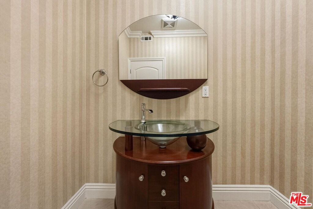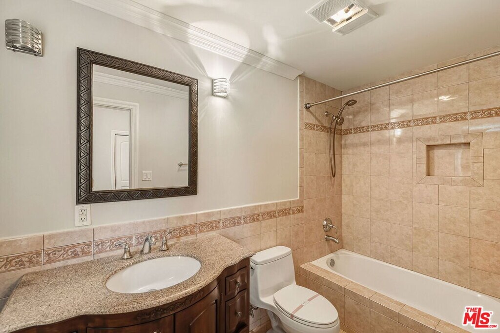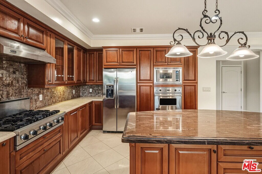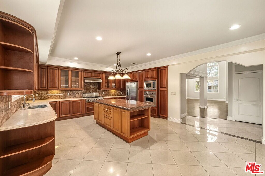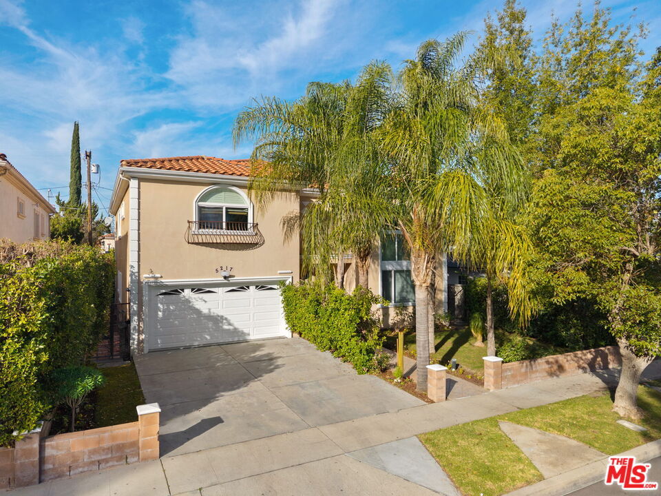 A grand two-story entry sets the tone for this exceptional Tarzana residence, where a crystal chandelier illuminates an elegant curved staircase adorned with ornate wrought-iron railings. Built in 2006, this 3,830-square-foot home delivers the rare combination of architectural distinction and everyday livability. The main level flows effortlessly from formal living and dining spaces to a chef's kitchen appointed with rich cherry cabinetry, Viking appliances, a granite island, and a mosaic tile backsplash. Hardwood floors and crown molding carry throughout, while the adjacent family room opens through large sliding glass doors to a landscaped backyard for California indoor-outdoor living. Five bedrooms, each with its own en-suite bathroom, provide uncommon privacy and flexibility. A main-floor suite accommodates guests or serves as a private home office. Upstairs, the expansive primary retreat features a walk-in closet, private balcony, and spa-inspired bath with dual vanities, soaking tub, and oversized walk-in shower with multiple shower heads. Additional bedrooms offer balcony access and generous proportions. Thoughtful details abound: designer powder room with vessel sink, recessed lighting throughout, gas fireplace, laundry area, and attached two-car garage. Located just south of Ventura Boulevard with easy access to dining, shopping, acclaimed schools, and the 101 freeway. A home of this caliber in prime Tarzana South is a rare find. Schedule your private showing today. MLS# 26640137