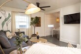 Feel at home in this quaint flat nestled above a boutique hair salon in a beautiful historic home in the heart of downtown Boise. This 2-bedroom, 1-bath apartment is perfectly located just two blocks north of the Capitol Building, between Boise's iconic foothills and its vibrant downtown. This unique space has been tastefully furnished and is complete with a full kitchen, sleeper sofa, and in-unit washer/dryer. The kitchen includes an electric range, electric skillet, electric kettle, and dishwasher, as well as a refrigerator, extra sheets and bedding, and towels. Kid-friendly amenities are available upon request, including a pack 'n' play and high chair. Please reach out before your stay if you would like to request any of these as they are limited in supply. The location is truly what makes this space unique. The Boise Foothills are the perfect getaway from the city and just a short walk through the VA campus will put you at the Military Reserve trailhead. Just south of the trailhead you will find the Boise Bike Park that offers terrain for riders of all levels. The trail system is expansive. After your ride in our lovely foothills, you can park your bike at the house and walk south down 6th street, through the Idaho Capitol campus, through Cecil Andrus Park, in front of Boise's historic post office and you will come to 8th Street, Boise's restaurant row (about a 10-minute walk). This is the City's hub for fine dining and your access point to Boise's iconic Freak Alley, the largest outdoor mural and graffiti gallery in the Northwest. A small boutique hair salon operates on the first floor. During regular business hours, please keep music and television at a reasonable volume as not to disturb the stylists and their clients below. After the salon is closed, you'll have the entire place to yourself. Please kick off your shoes when you get home. Registration Number: 082158L [SI]