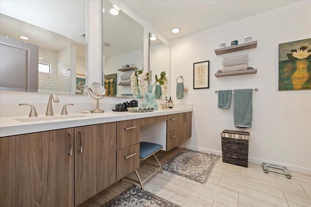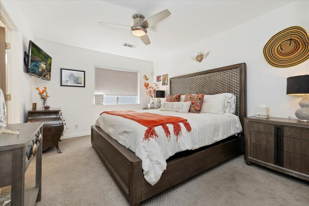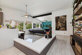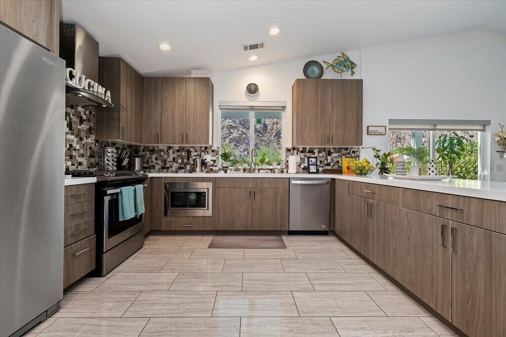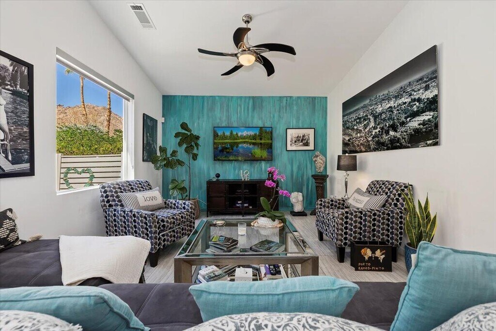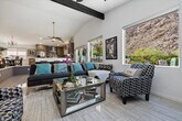 This spectacular contemporary residence sits on a rare oversized lot with a west-facing backyard and dramatic Santa Rosa Mountain Views. Fully furnished and move-in ready,it's the perfect long-term rental for those seeking comfort and style in the desert. Enjoy a private outdoor oasis with a Lap Pool,Alumawood Lattice Patio,Fire Pit with Cobalt Blue Glass,Artificial Turf Yard,and lush tropical landscaping. Inside,the open floor plan features an updated kitchen with quartz counters and stainless-steel appliances,plus a sunken living room that flows into the dining area and breakfast bar. The home offers two spacious bedrooms and two spa-like bathrooms with floating vanities and quartz finishes. Elegant porcelain floors enhance the main living areas,while plush Berber-Style Carpet brings warmth to the bedrooms. Stunning desert landscaping and beautiful palms create impressive curb appeal. This home combines modern design,turnkey convenience,and desert lifestyle,an exceptional opportunity for long-term renters.