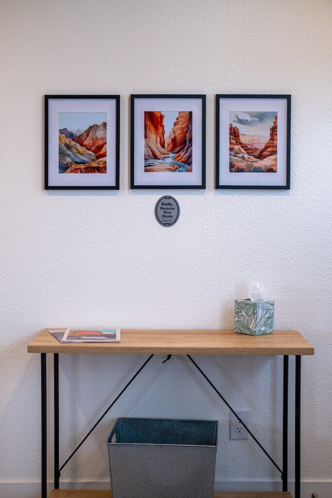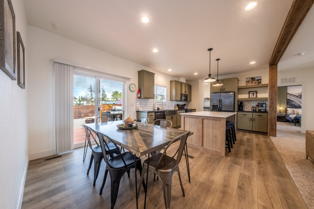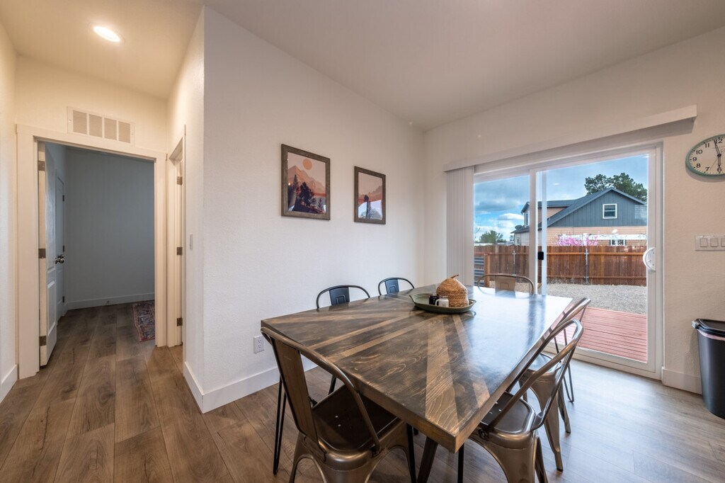 Welcome to Desert Tracks, a cozy and adventure-ready home in Kanab, perfectly located near scenic trails and real dinosaur tracks. Feel at home in this ideal home base for your Southern Utah adventures. This desert getaway offers a peaceful, comfortable retreat. The open-concept living, dining, and kitchen space is perfect for gathering after a day of exploration. The living room features comfortable seating and a Smart TV for streaming. Cook your favorite meals in the fully equipped kitchen, complete with modern appliances and all the essentials. A full washer and dryer make this home ideal for both short stays and extended trips. Step out onto the spacious deck featuring a dining and seating area, your go-to spot for morning coffee or unwinding in the evening. From here, walk directly to your private hot tub. Pets are welcome at the cost of $10 per pet, per day. Emotional support animals fall under this requirement as they do not have the same rights as service animals under the ADA. A pack-n-play can be provided for an additional fee of $150, subject to location and availability. Minutes away from Coral Pink Sand Dunes, Red Canyon Slot, Zion National Park, and the Grand Canyon, this home sits in a truly authentic desert landscape, surrounded by native desert plants and natural habitat. No smoking or vaping is allowed on the premises. A $200 per day fee will be assessed for each day of the reservation if it is found that guests have been smoking or vaping on the premises. For unauthorized pets, a $250 fee will be assessed. Quiet hours begin at 10:00 PM each night and continue until sunrise. A $500 fee will be assessed if the cleaners have to move furniture to reset the property for the next guest. Minutes Away From: Coral Pink Sand Dunes - 14 miles Red Canyon Slot - 31 miles Zion National Park - 41 miles Grand Canyon - 80 miles [SI]