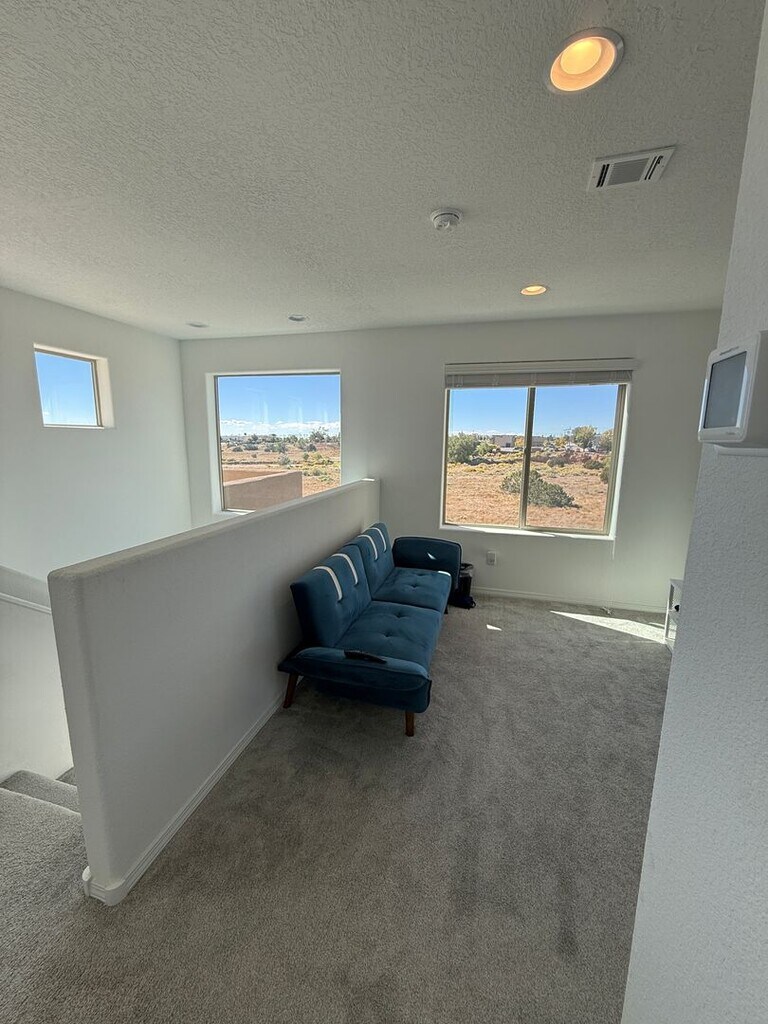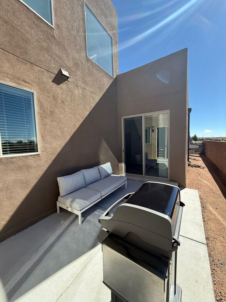 Built in 2023 is this 2000 sq. ft. 3 bedroom, 2 1/2 bath townhome on a corner lot with Views to the West for spectacular sunsets. This has been owner-occupied and is in excellent shape. Large open living room with views to the North that faces a park/open space area. The dining room is good size with patio doors that open to a private courtyard with Sunset views. Enjoy a large open kitchen, lots of light, stainless steel appliances, kitchen island and a side counter/bar area. Plenty of counterspace and cabinets plus large pantry. Down the hall is an under-stairs closet, large laundry room with full-size washer/dryer and the master bedroom with ensuite bathroom. There is a spectacular oversized shower, double vanity & nice window and a private toilet area. The downstairs area is tiled for easy cleaning. Upstairs has beautiful natural light with west facing window over the stairs & skylights. At the top of the stairs is a small nook area perfect for a desk/workspace in addition to a loft area that can be an exercise space or TV room. There are 2 good size bedrooms on this level and a full bath. The stairs are carpeted as is the upstairs area & bedrooms. This home has a 2 car attached garage, central Heat & Air, a Tankless hot water heater, plus an in-ground irrigation system to water the shrubs in the front of the house during the warmer months. Conveniently located off Gov. Miles Rd. just minutes from Presbyterian hospital and the new Nexus Health center. Walmart and plenty of restaurants are only minutes away as well as easy access to I-25. A small dog (25lbs max) will be considered. NO CATS! NO Smoking or vaping allowed in the house or within 25 feet of the house. Contact us for a showing today!