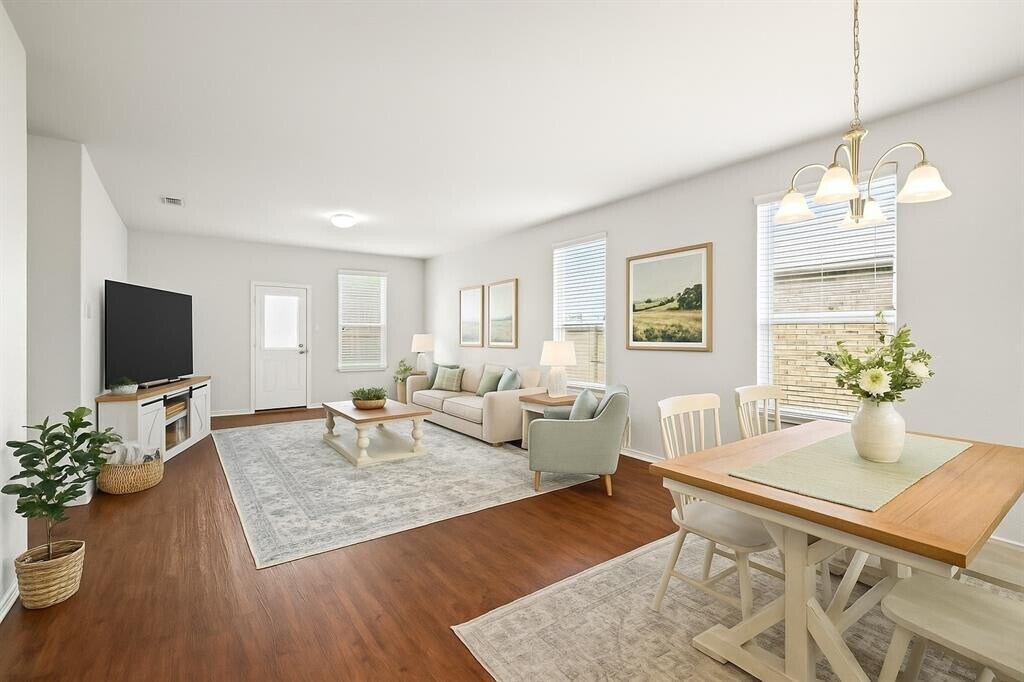 Built in 2019 and offering over 1,700 square feet, this thoughtfully designed home captures the essence of modern living—where comfort, connection, & style meet in perfect harmony. From the moment you step inside, you’ll feel an instant sense of ease & belonging. Freshly painted & beautifully maintained, the home features lovely wood flooring & an open-concept layout that flows effortlessly from the inviting living room to a dining area perfect for gathering with family & friends. The sleek, contemporary kitchen combines style & functionality with quartz countertops, a spacious center island, & abundant cabinetry for all your storage needs. Sunlight pours through expansive windows, filling the home with warmth & a bright, airy ambiance. A dedicated home office provides the ideal space for productivity or quiet focus—perfectly suited to today’s lifestyle. The primary suite offers a true retreat w/ a generous walk-in closet & a luxurious walk-in shower for your end-of-day escape. Two additional bedrooms provide flexible options for guests, hobbies, or a media room. Impeccably clean & truly move-in ready, this home includes a refrigerator, washer, & dryer, plus thoughtful touches like a water softener, doggy door, & a small outdoor storage unit for extra convenience. With its timeless brick-and-masonry exterior, 2-car garage, & beautifully balanced design, this residence delivers understated luxury & everyday comfort in one perfect package. Located in the vibrant Sunfield community, residents enjoy unparalleled resort-style amenities, including an elementary school, walking trails, fishing ponds, on-site lifestyle activities coordinator, open-air pavilions, a splash park, a junior-size Olympic swimming pool, & two lazy rivers. Sunfield’s prime location offers unbeatable convenience too! Just 3 minutes to IH-35, 5 minutes to the 130 toll road, & mere moments from premier shopping, dining, & everyday essentials. Turn the key to your next chapter in this exceptional home!