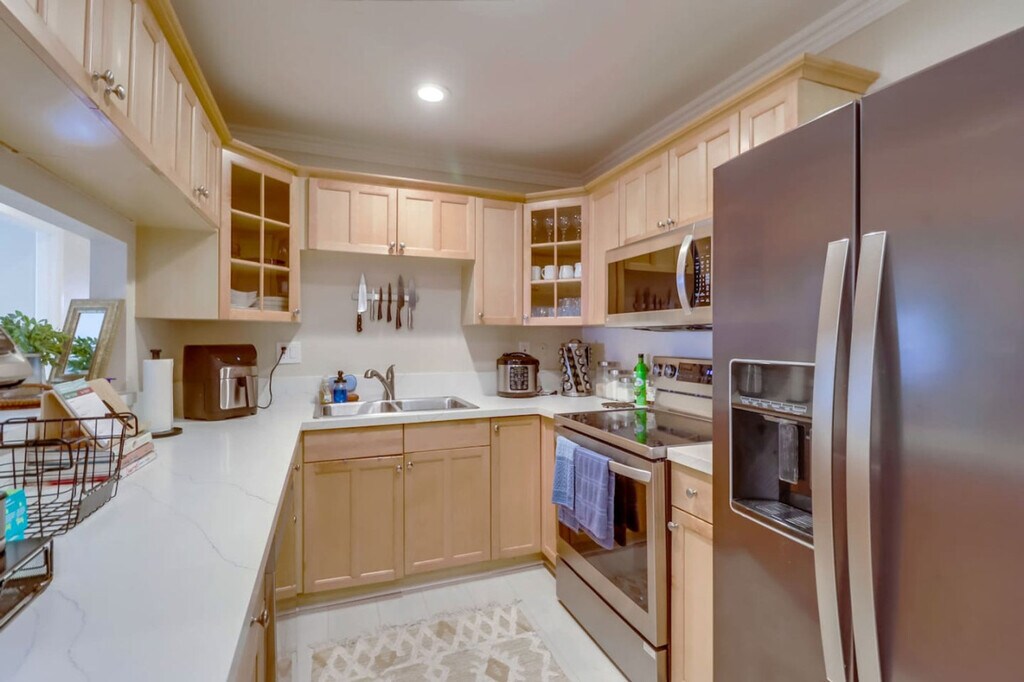 Welcome to this modern 3-bedroom, 1186 sqft home in Chula Vista. Feel at home with convenient parking for two cars, including one permanent space and one guest space available from 6 AM to 10 PM. The property is pet-friendly and located just 5-10 minutes from shopping centers and local restaurants. The kitchen is fully equipped for all your culinary needs, featuring a gas stove and oven, blender, toaster, cooking pans, baking trays, and essential supplies like coffee, oil, sugar, and salt. Modern appliances include a coffee machine, microwave, and fridge, perfect for guests who love to cook and dine in comfort. The dining area offers tables and chairs for enjoying your meals. The air-conditioned living area features flat-screen smart TVs with cable and streaming services, providing endless entertainment options from the comfort of snug couches. Enjoy free access to the pool, hot tub, and sun loungers, along with a private balcony for stunning views. Parking is available for two cars, with one assigned space and one guest space from 6 AM to 10 PM. Pets are welcome with a fee of $100 per night per pet. Situated in Chula Vista, this home offers easy access to shopping centers and local restaurants within a 5-10 minute drive. For accurate distances to specific locations, use Google Maps with the address 'Telegraph Canyon Rd, Chula Vista, CA 91910'. The property has a strict no-noise policy to avoid neighbor complaints. All activities after 9 PM must be inside with doors and windows closed. Violations of the noise policy may incur a $1000 penalty. Late check-out after 11:00 AM may be available upon request, but unauthorized late check-out will be fined at twice the nightly rate. Each unauthorized guest or pet will incur a $100 per night penalty. Please report any damages or issues immediately, and ensure all windows and doors are locked when leaving. Dispose of trash in provided bins and avoid putting trash or toilet paper in toilet bowls to prevent plumbing issues. No food is allowed in bedrooms to maintain cleanliness. For those working remotely, the home offers a choice of desks and chairs both inside and outside, along with 500Mbps Wi-Fi, making it easy to host online meetings or share large files. [SI]