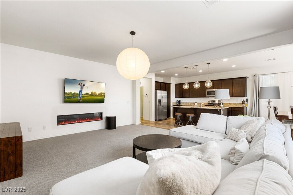 Welcome to this beautifully appointed fully furnished townhouse in the heart of Summerlin. This charming 3-bedroom, 2.5-bathroom home features a warm and inviting layout designed for modern living. Step inside to an open-concept living area enhanced by a sleek electric fireplace, creating the perfect ambiance for relaxing or entertaining. The kitchen is a standout, showcasing granite countertops, mocha cabinets, pendant lighting, and stainless-steel appliances, making meal preparation both effortless and enjoyable. Upstairs, the spacious primary suite offers a peaceful retreat with a beautifully customized built-in closet system for exceptional organization. Two additional bedrooms provide flexibility for guests, work-from-home space, or family needs. This home is move-in ready with tasteful décor and functional pieces that complement each room. Located in a desirable gated community in Summerlin, you’ll enjoy nearby parks, shopping, dining, and quick access to major roadways.