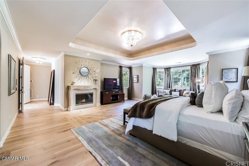 Luxury contemporary Mediterranean villa located behind the prestigious gates of Mountain View Estates. Grand two-story foyer with dramatic chandelier, custom stair railing, and wide-plank oak floors. Formal living and family rooms feature fireplaces, coffered ceilings, rich wood paneling, built-ins, and a sunken wet bar. Formal dining room connects through butler's pantry to remodeled center-island kitchen with granite counters and Viking professional appliances. Main level includes powder room, maid's quarters, and laundry room. Upstairs offers four guest suites with designer-remodeled baths. Spacious primary suite features fireplace, separate exercise room, dual walk-in closets, and spa-style bath. Resort-style backyard includes covered lanai with dual-sided fireplace, outdoor kitchen with teppan grill, sport court, putting green, fire pit, and PebbleTec pool and spa with fire and water features.
