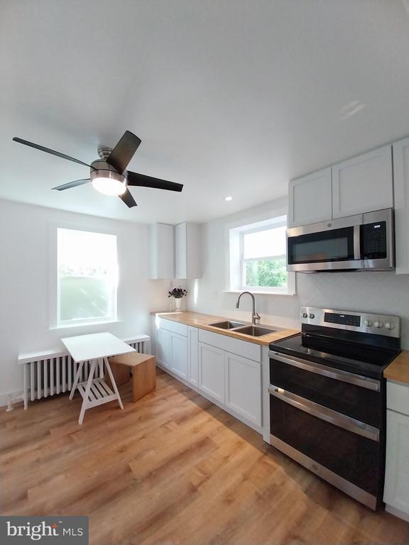This lovely one bedroom first floor apartment is ready for a new tenant(s). The entire unit has been beautifully renovated in 2025. The original kitchen was gutted and replaced with new cabinetry, butcher block countertops and all new appliances, which include a built in microwave, oven with convection and air fryer settings, and refrigerator with ice maker and water dispenser. Beautiful refinished hardwood floors are a highlight throughout the apartment. The Italian marble shower with multi shower heads is a notable bathroom feature. The spacious bedroom has a stackable washer/dryer making laundry day a breeze. A full wall bookcase/storage unit is the highlight of the bright and spacious living room. The entire unit has been recently painted, all windows are new. The lucky new tenant(s) will have use of the front porch, as well as one off street parking spot.