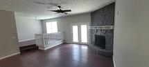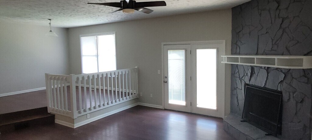 Sunken living room w/ Fireplace & Ceiling fan. Master bedroom with sliding glass door to step into the deck, some new doors. LVP Floors in Kitchen, Dining Room, 3 BRMs, and 2 Baths. HVAC system, water heater, garage door opener - all, one year old. Refurbished kitchen has ; cabinets, refrigerator, range, dishwasher, and microwave - all, one year old. Laundry room in the kitchen. Dining room is off to the kitchen.