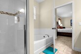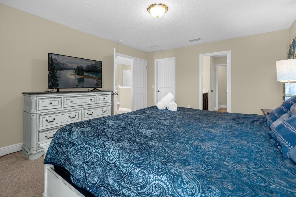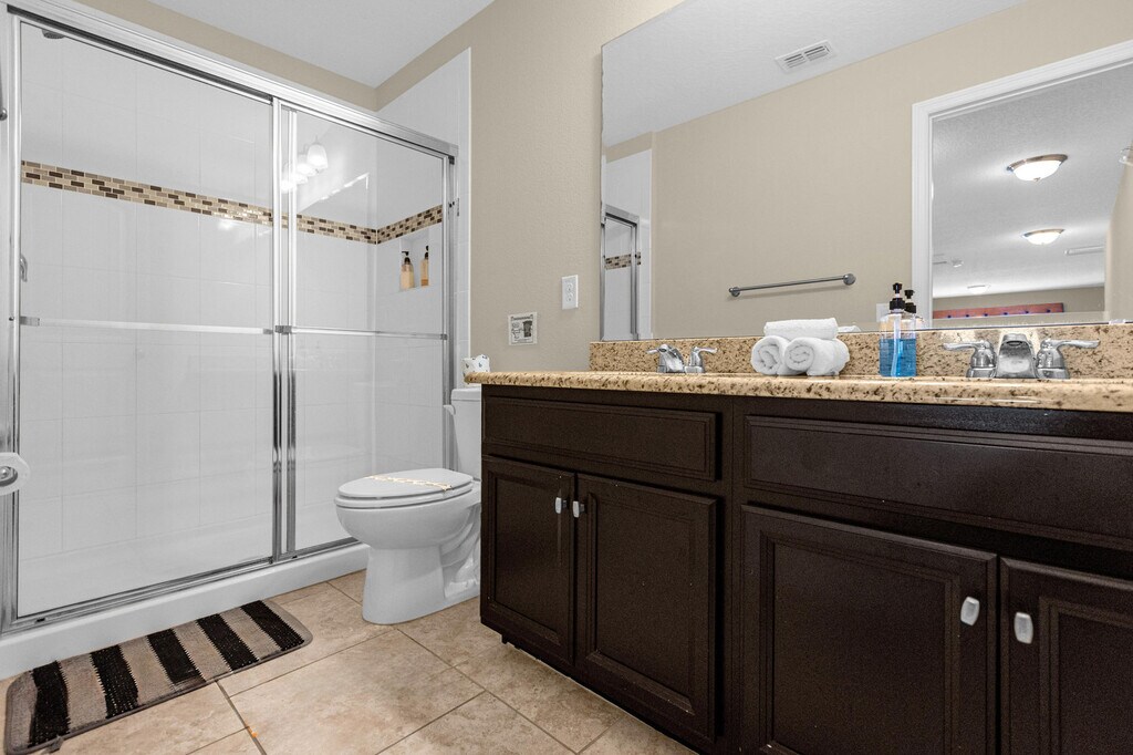 This amazing villa is located very close to Disney, making it a perfect choice for family and friends visiting Orlando. With six bedrooms and five bathrooms conveniently arranged for your comfort, you'll feel at home in this spacious retreat. Enjoy the private pool, which is covered and can be heated upon request, and take advantage of the resort amenities such as the lazy river, slides, gym, and more at the Tiki Bar and Club House. The villa offers a well-thought-out floor plan to accommodate your group comfortably. Downstairs, you'll find a king en-suite bedroom, while upstairs features another king en-suite, two queen bedrooms, and two bunk bed rooms with full and twin beds. The villa also includes a half bathroom and a full bathroom downstairs for added convenience. Guests who wish to use clubhouse amenities will need to register at the club house and pay a $45 fee per household. Pool and spa heating is available for a fee of $40 per day with a two-day minimum. A small 18-inch charcoal grill is provided at no cost, but other vacation gear or a propane grill must be outsourced at your own expense. Only small pets or dogs under 40 pounds are allowed with a $150 pet fee per animal, and any damages or extra cleaning caused by the pet will be charged. The driveway can fit up to three cars, and the garage can accommodate up to two cars. Located just 20 minutes from Disney, 30 minutes from Universal, and 15 minutes from Sea World, this villa is perfectly situated for exploring Orlando's top attractions. With a mall, supermarket, and restaurants only 5 minutes away, you'll have everything you need within easy reach. Guests must register at the club house to use the amenities and adhere to the community's parking policy, which prohibits parking on the grass, blocking homes, or in non-marked areas. Linens and towels are provided at the start of your stay, but washcloths are not included as they are considered personal items. [SI]