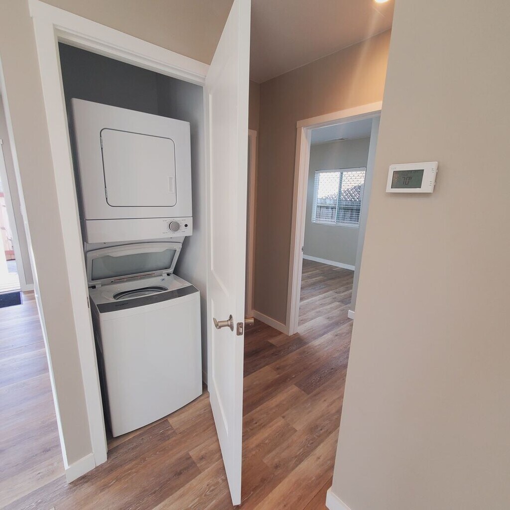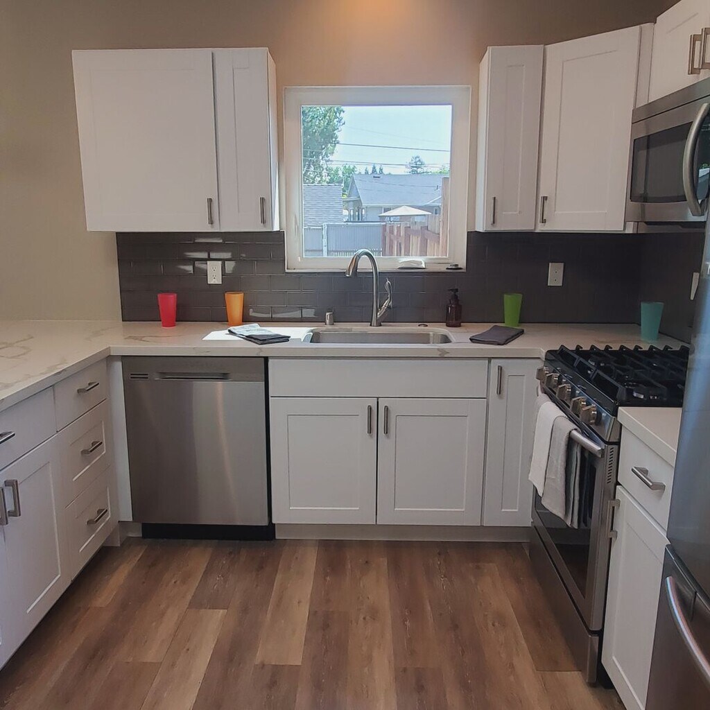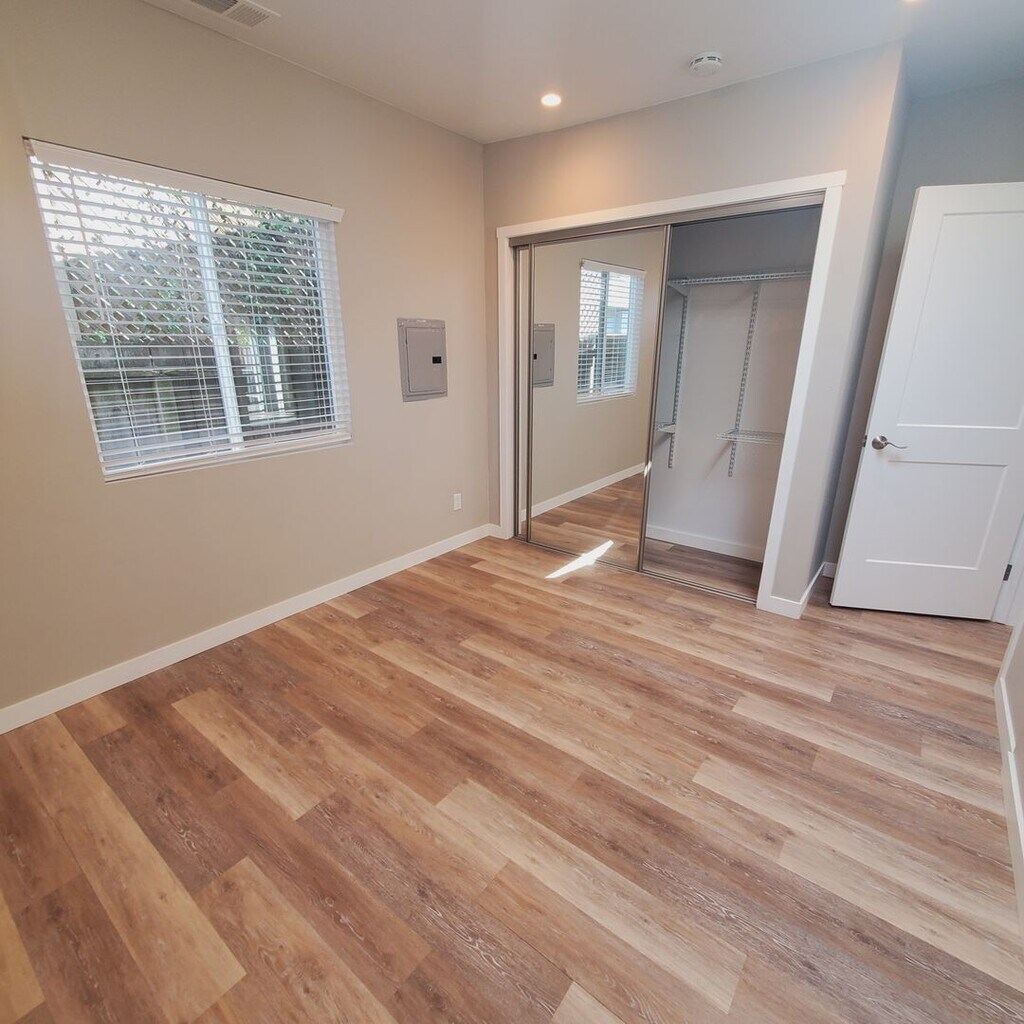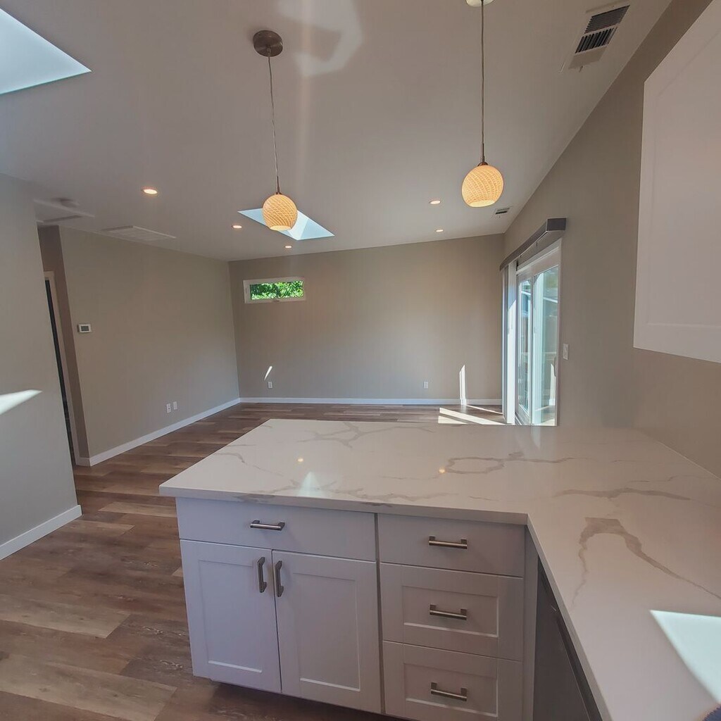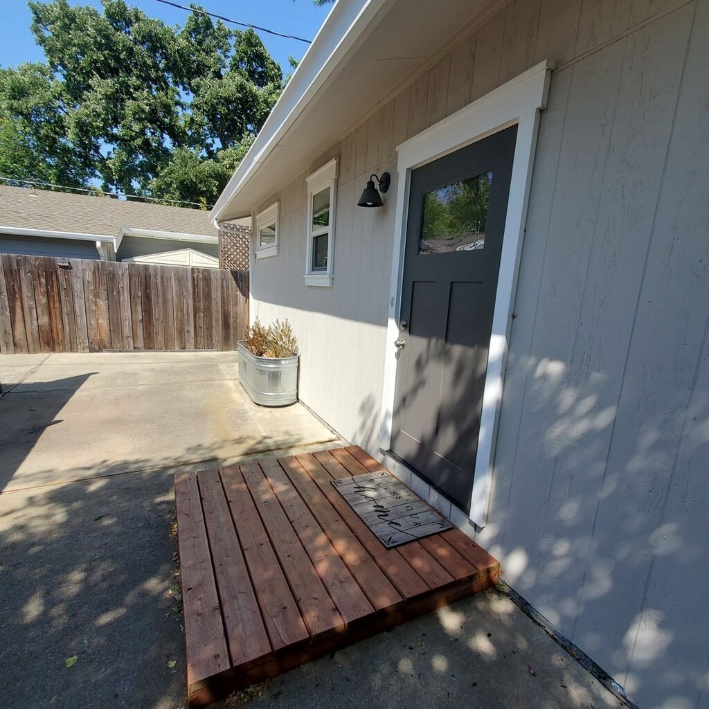 Poet's Corner ADU property with private yard and entrances offers 2 bedrooms and 1 bathroom and is ready for a meticulous tenant. This place sparkles with great light & richly detailed upgrades. Gardener and Utilities (except garbage) are included which is a great value. Spacious single-story open floorplan with skylights throughout and clerestory windows that give privacy yet picturesquely bring in views of nature. Entering from the front door you are greeted by a beautiful kitchen, updated with white, modern, clean-line cabinetry & counters, gas range, microwave rangehood, dishwasher and full size refrigerator. A skylight brings in extra light. Pendant lights over the center counter make it perfect for a quick breakfast or gathering place while entertaining. Easy maintenance, richly-colored continuous flooring blends nicely with the neutral paint tones and recessed lights brighten every room. The dining/living great room also has a skylight and ample space to align with decorating choices. From the living area you walk out a dual pane patio door onto a sizeable deck to enjoy oaks and the tree-lined creek that runs adjacent to the property. Your outdoor space expands to a paver patio and gravel area. Insulated Tuff Shed is a fantastic perk for storage, craft space, sporting equipment, you name it. Take advantage of the varied landscape and live at your own speed - add plants, a nice patio set, hammock or firepit. The bath offers a roomy shower stall with gorgeous tile and fixtures. The rest of the bathroom has shite subway tile and upgraded fixtures, excellent lighting, bathroom fan, and a window for natural light. The bedrooms both have skylights and large closets with organizers. The rooms are serene. Dual pane windows with coverings and Central HVAC will keep you comfortable year-round. Parking is included, with covered and uncovered spots. The front property, which currently has long term tenants, has parking in front of their garage. Close to schools, parks, trails, shopping & great restaurants and coffee shops. Tenant pays garbage only - all other utilities are included, plus the gardener. No Smoking. 1 year lease to start. 1 pet may be allowed upon approval, with size restriction, other than service and support animal. Must meet income guidelines and credit score 650 or above. Tenant's must obtain renter's insurance. Apply with Drysdale Property Management only. Private viewings arranged via email communication.