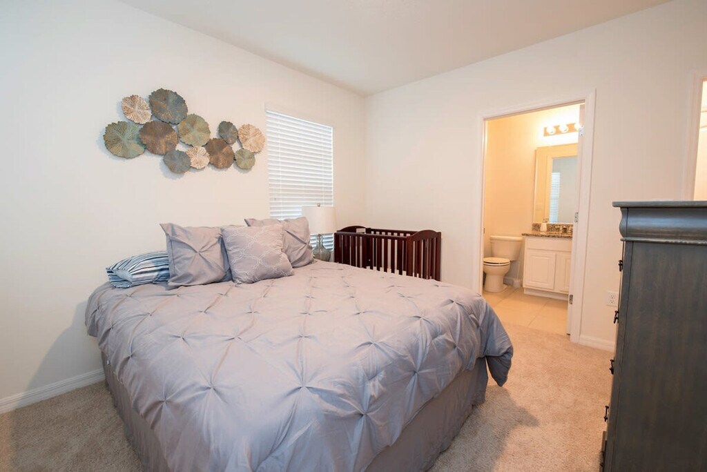 Welcome to our exquisite 5-bedroom villa located in the prestigious Solterra Resort in Davenport, just minutes away from Orlando's world-renowned attractions. This villa offers a perfect blend of comfort and luxury, featuring themed rooms for kids and access to Solterra's water park. Situated in a gated community with upscale amenities, this Central Florida gem provides a delightful retreat for families and groups. The villa is thoughtfully furnished to ensure a comfortable stay, with themed rooms for kids and ample space for families or groups. Enjoy the cozy living areas, a well-equipped kitchen, and comfortable bedrooms that offer a relaxing vacation experience. The interiors are tastefully decorated, providing a welcoming atmosphere with modern amenities throughout. For short-term renters, a Leisure Patron Amenity Access Fee is charged at the clubhouse front desk upon check-in. The fee is $35 for 1-12 guests and $45 for 13 or more guests, payable via credit or debit card. This one-time fee per house per reservation grants access to the resort's amenities, including the pool and gym. Pool and spa heating is available for an additional fee of $45 per night, with a minimum three-night charge. Solterra Resort is ideally located just minutes from Orlando's top attractions, including Walt Disney World, Universal Studios, and Sea World. The resort is close to supermarkets, stores, and an Imax movie theater, offering convenience and entertainment options for all guests. Enjoy easy access to theme parks, shopping centers, dining options, and entertainment venues. Quiet hours are observed between 10:00 PM and 7:00 AM. Only guests aged 25 and older are allowed unless accompanied by a responsible adult. No parties or events are permitted, and only registered guests can stay overnight. Vehicles parked in violation of parking rules are subject to towing. Charcoal grills are prohibited, and a financial fine of up to $500 may be imposed for violations. Pool and spa heating requires a 24-hour notice and may not function optimally in extremely cold weather conditions. A remote work-friendly environment is provided with high-speed Wi-Fi and comfortable seating areas, making it convenient for guests who need to work during their stay. [SI]