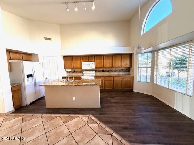 Welcome to Rancho Del Mar: an inviting,no-HOA neighborhood ideally located near the 101 & 60 freways & just minutes from Costco,Home Depot,WinCo,& other shopping & dining. 3 Bedrooms plus a den/office/or 4th bedroom. This beautifully maintained home has spacious open floor plan w/vaulted ceilings,tile floors & fresh paint throughout. Enjoy both formal living & separate family rooms! Kitchen has maple cabinets,gorgeous granite,Lg island,plus an eat-in area. The Primary suite has double sinks,garden tub,Lg walk-in shower w/seating in shower,separate toilet room & a spacious walkin closet. Backyard has an extended covered patio,garden area,grassy yard & a storage shed. Easy-care desert landscaped front yard. 3 car garage w/built in cabinets. This is a beauty!