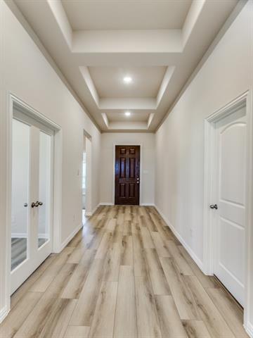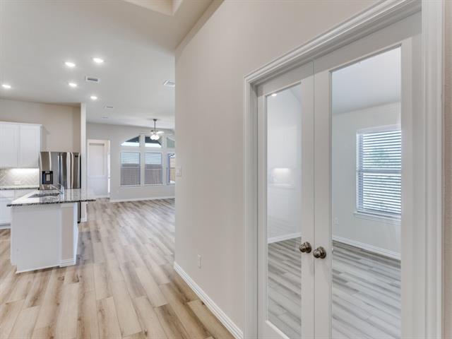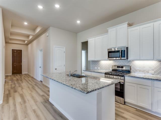 Brand new never lived in! Enjoy all the benefits of a new home including energy efficiency, todays latest design style and low maintenance. No rear neighbors for added privacy!! Stone accent, cedar shutter and covered porch create an attractive curb appeal. Luxury vinyl plank flooring flows from entry throughout living areas and hallway. Coffered ceiling at entry creates a striking focal point. Open concept design with 10’ ceilings really open up the space. Large living area opens to spacious kitchen. Kitchen offers a huge island with a breakfast bar, stainless steel appliances including the refrigerator, gas range oven, granite counters and subway tile backsplash in herringbone pattern. Separate home office with glass French doors. Primary bedroom is split for added privacy. Primary bath offers dual sinks with large vanity, walk-in shower and walk-in closet with built-ins. Tankless water heater for those long relaxing hot showers… Bedroom 2 off the entry is split and adjacent to full bath would make a great area for in-law, teen or guests. Outback includes a 12 x 12 covered patio with a gas jet for the grill and plenty of yard for the kids to play! Neighborhood includes a community pool and playground! Easy access to highway 287 and highway 67.