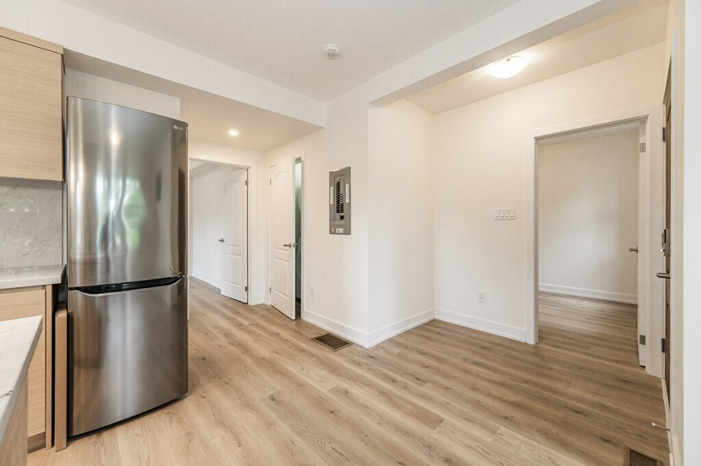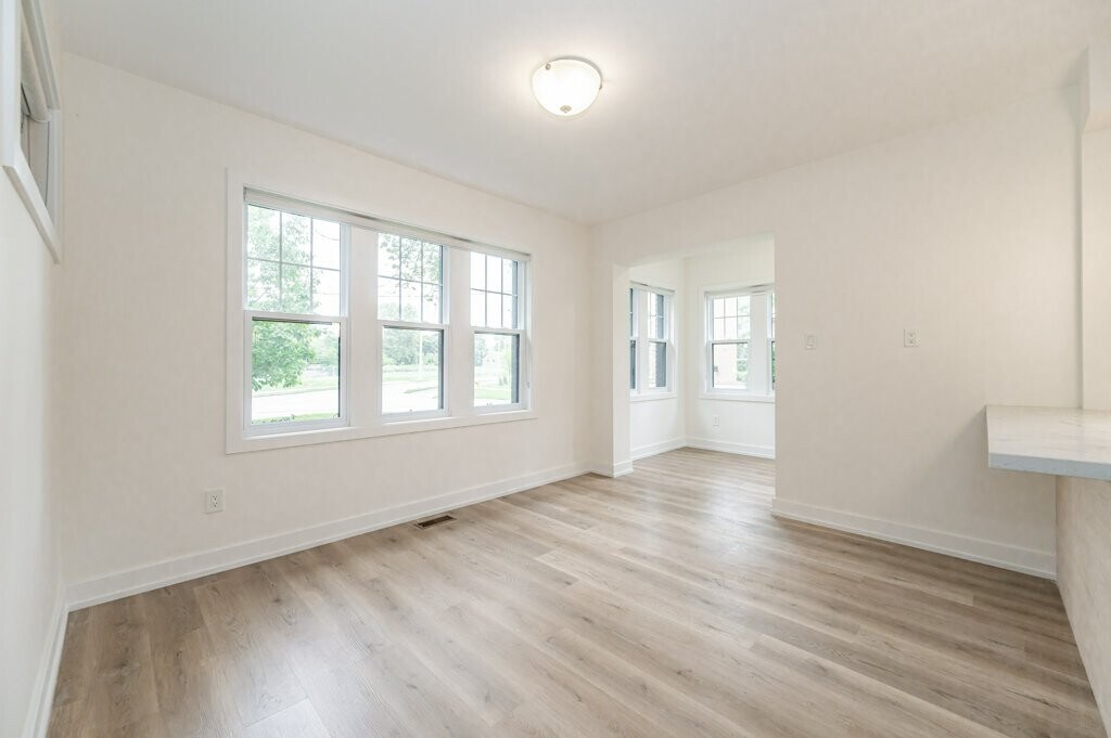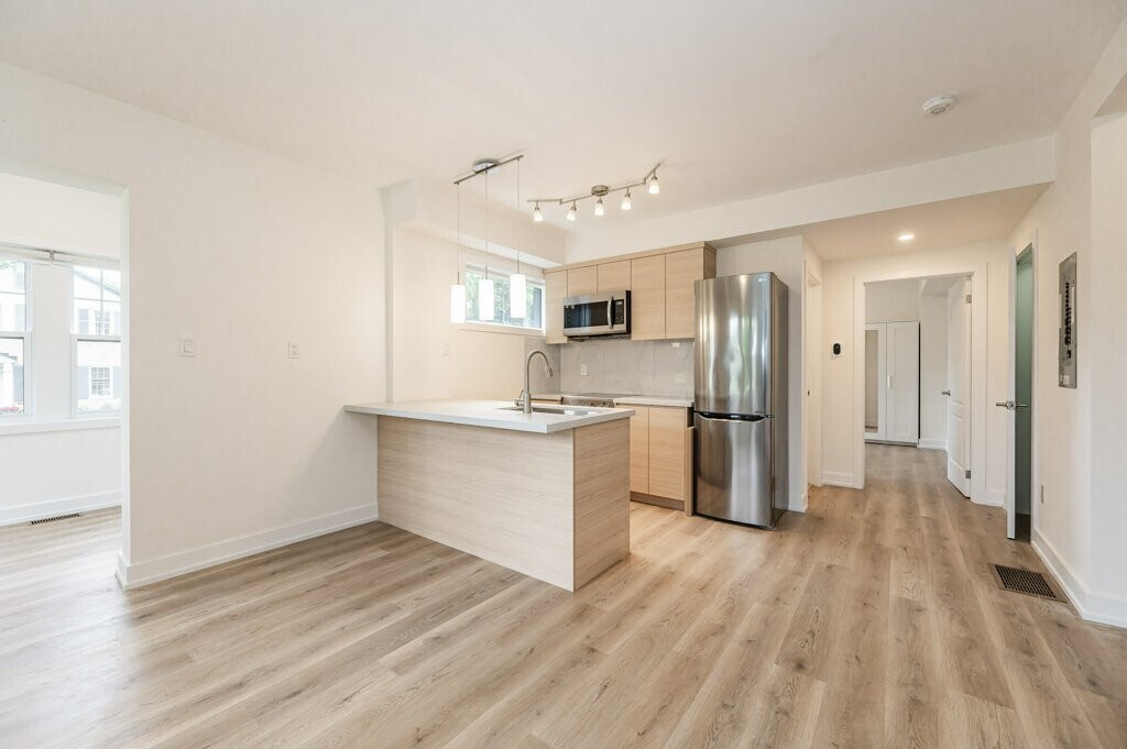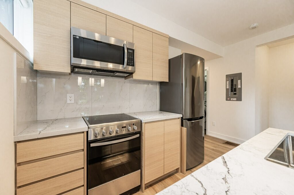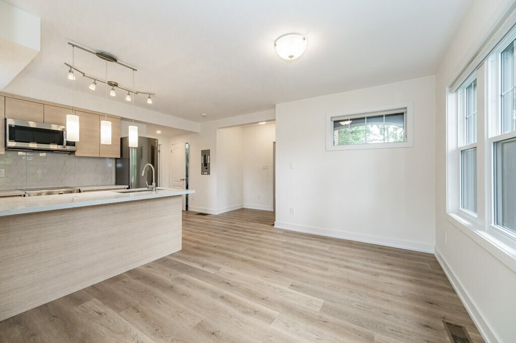 To arrange a viewing, please reply with your full name, contact number, email, and a short introduction. Unit A is available on December 1, this beautifully renovated two-bedroom plus sunroom, one-bathroom apartment is located in a charming century triplex in Kitchener’s Heritage Olde Berlin Town. This bright, energy-efficient ground-floor apartment includes one parking spot, and tenants pay all utilities with their own gas, water, and electricity meters. The apartment features insulated exterior walls, new windows with rolling blinds, wood-look vinyl flooring, and an open-concept kitchen with stone countertop, island, and stainless steel appliances including fridge, ceramic-top stove, microwave with rangehood, and dishwasher. The bathroom is renovated with a modern glass shower, and in-suite front-load washer and dryer are included. The front porch is for exclusive use. Located on a quiet tree-lined street in the Civic Centre area, the apartment is steps from Civic Centre Park, Kitchener Public Library, The Registry Theatre, Centre In The Square, and Kitchener Market. It’s also within walking distance to the Innovation District, Victoria Park, McMaster School of Medicine, UW School of Pharmacy, and the future transit hub with GO Train, Via Rail, Tech Companies, and ION LRT. Desire2Learn, Communitech, Manulife, shopping, restaurants, bars, farmers market, and City Hall are nearby, making this a prime downtown location. This is not the whole house. It is one apartment in a triplex with three units.