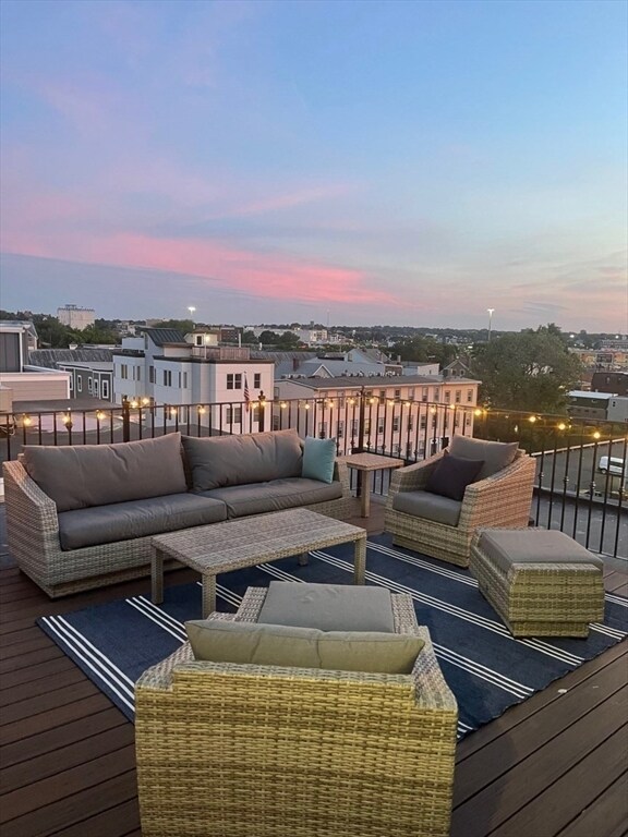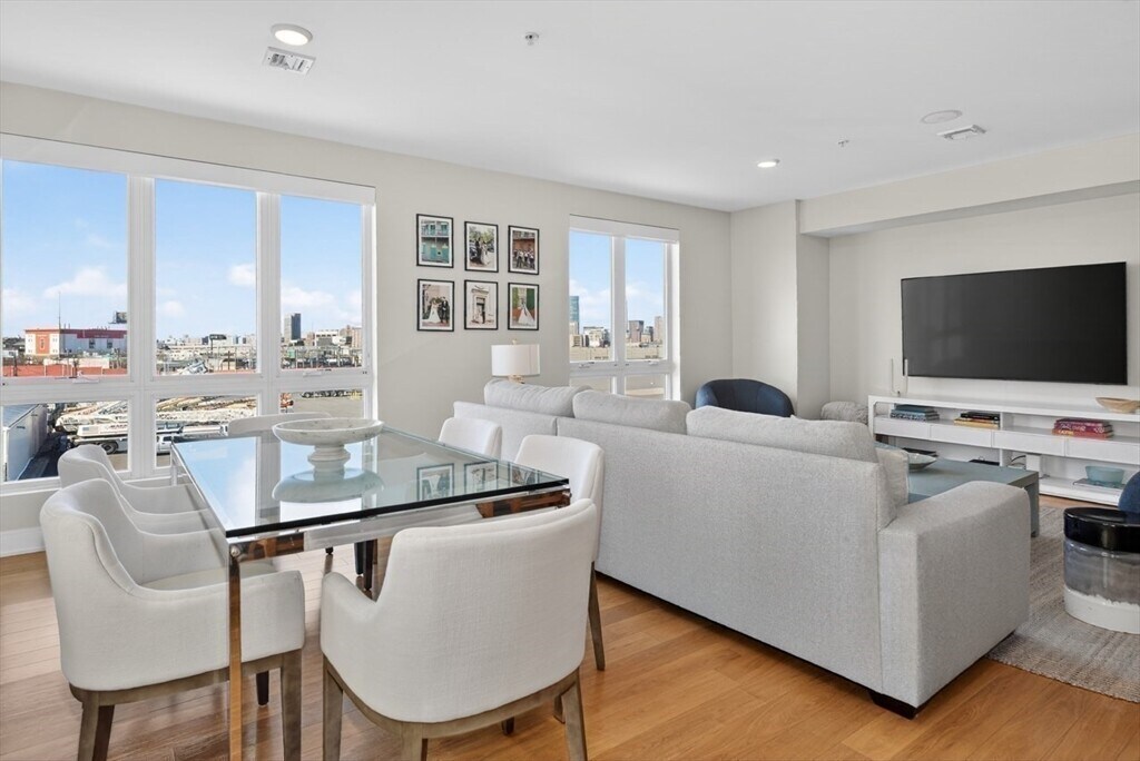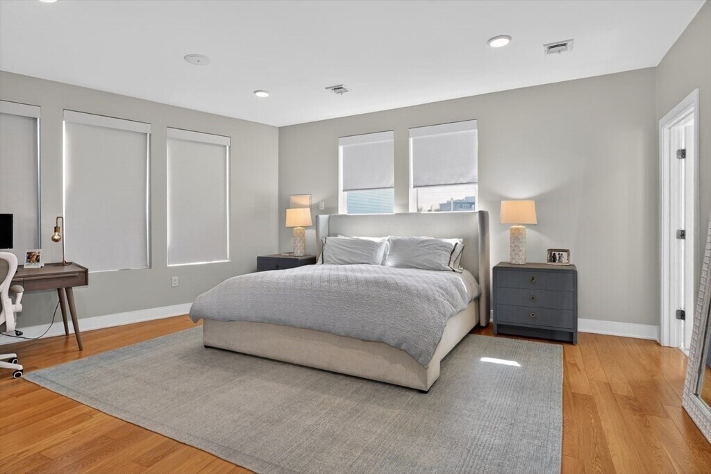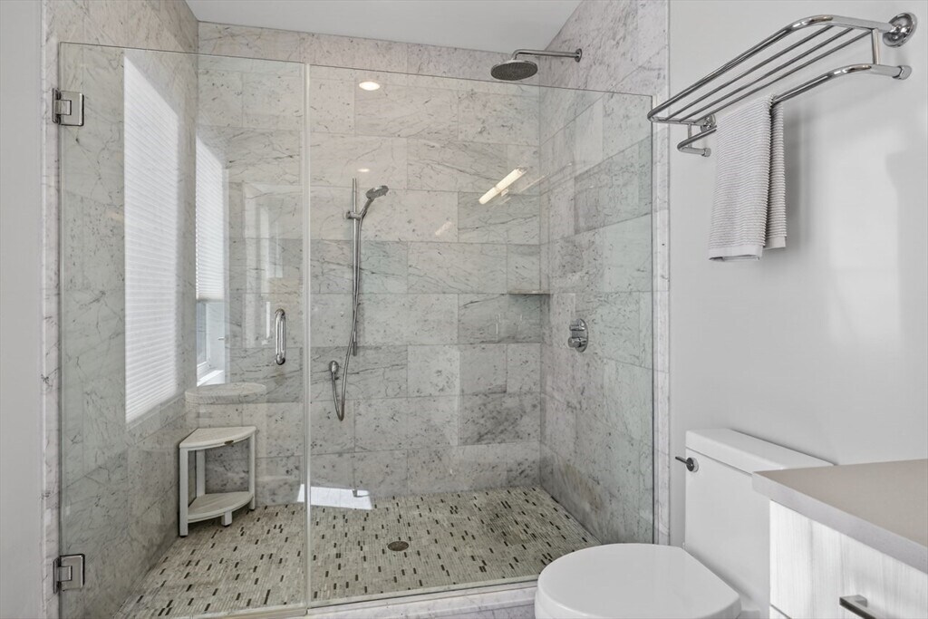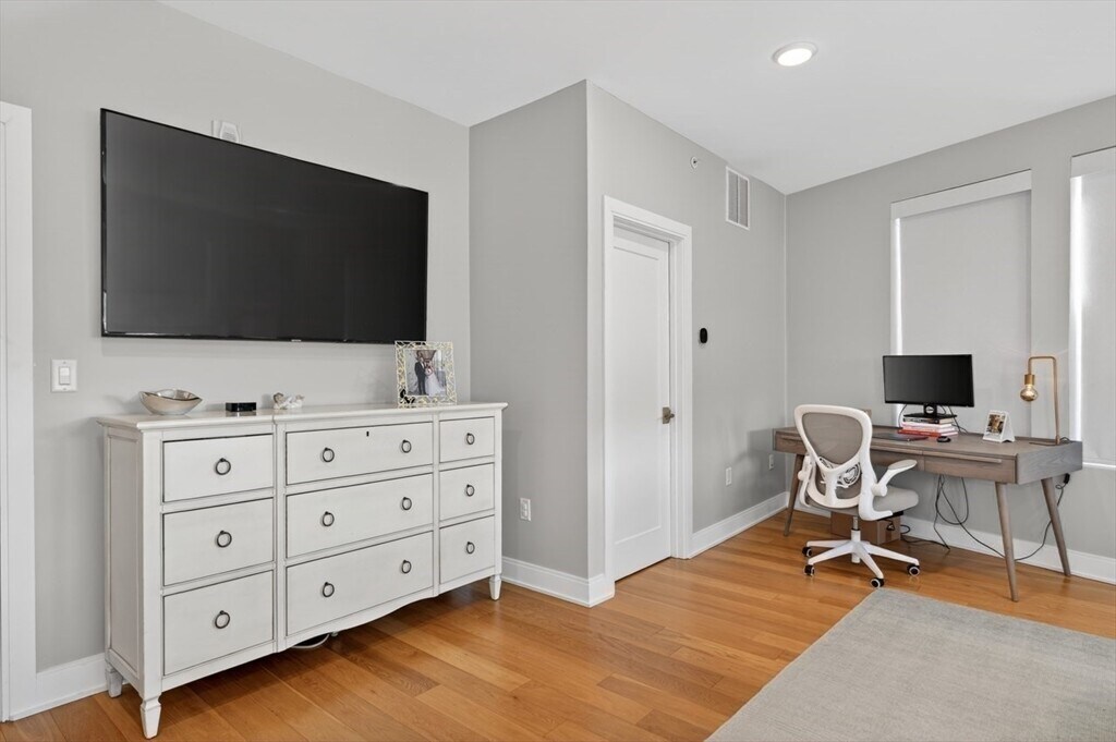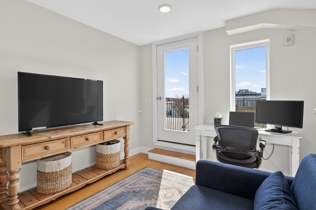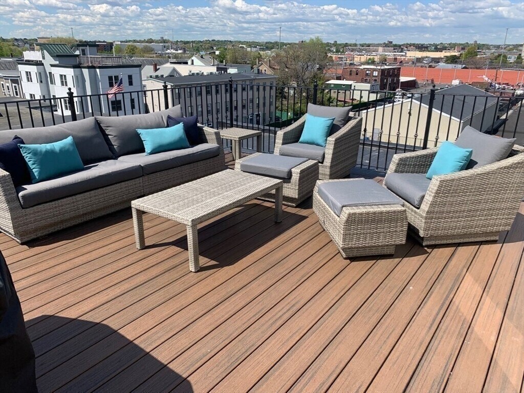 Spacious 2BR+office penthouse apartment with private roof deck in modern 2020 mid-rise elevator building. Open floor plan with generous living/dining room open to chefs kitchen outfitted with quartz counters,Wolf range,SS dishwasher,drawer microwave,& french door refrigerator. Large kitchen island with SS sink has additional wine fridge & counter seating. Oversized Primary bedroom with en suite bath & large walk in closet,generous 2nd bedroom,and 2nd full bath features double sinks. Light filled staircase to top floor loft/office space with wet bar & wine fridge with exterior door to your own private roof deck and expansive views of Boston. Hardwood floors throughout the unit with an abundance of closets including: walk in storage w/shelving system,separate laundry closet,& 2 add'l hall closets for storage solutions. Add'l features:1 car heated garage,sound system,washer/dryer,video intercom,central air. Steps to T,walk to restaurants,park,beach,pickleball,& more!! MLS# 73489413