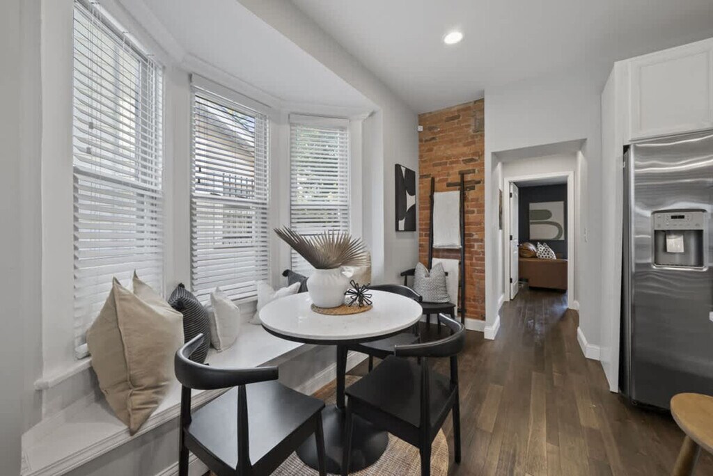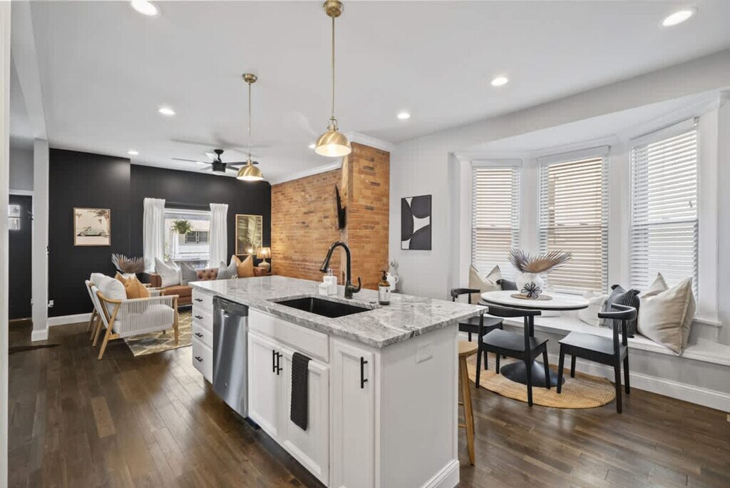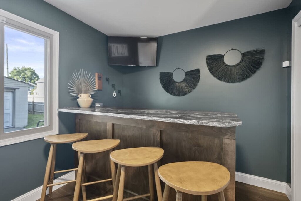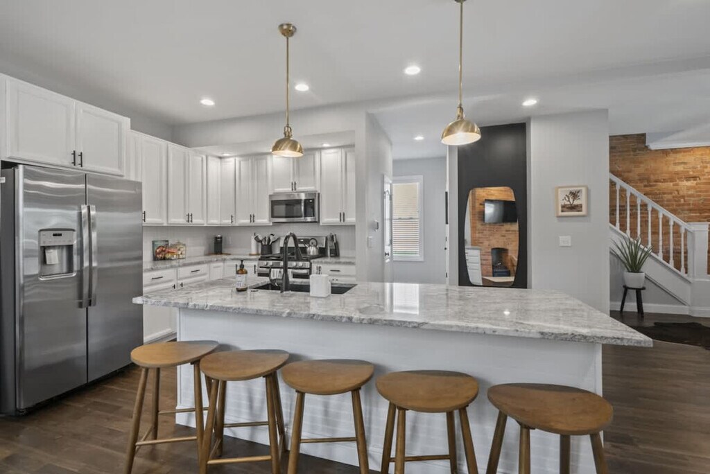 The advertised rate of $9,067/month is the lowest available price, based on a 30 day(s) stay with a move-in date of August 5, 2026. Rates vary depending on the duration of stay, season, and other parameters. For exact pricing and additional pricing components, please visit our website and enter your desired move-in and move-out dates. The rate is applicable when billed upfront; it can be higher if billed in multiple payments. Discover comfort, style, and convenience at this beautifully renovated 4-bedroom, 3-bath home in the Southern Orchards neighborhood. Feel at home steps from charming local character and within easy reach of top Columbus destinations. The first floor features a versatile bedroom with a fully equipped bar, a cozy queen pull-out couch, and a desk. The full bathroom features a walk-in shower. The warm living room has an exposed original brick wall, comfy seating, and a Smart TV. The chef-inspired kitchen has an open layout with a large island, bar seating, granite countertops, and a quaint dining nook. There is also a coffee station with a Keurig, drip coffee maker, syrups, teas, sugar, and creamer, as well as a convenient laundry room. The second floor includes a bedroom with a twin trundle bed, a bedroom with an elegant queen bed, and a shared full bathroom with a tub/shower combo. The master suite features vaulted ceilings, a king bed, a Smart TV, and an en suite bathroom with a luxurious walk-in shower. Enjoy the lovely front porch and the backyard oasis, fenced for privacy and featuring a 7-person hot tub, outdoor dining set, and firepit. The well-equipped garage offers a sauna, stationary bike, yoga mats, and free weights. Board games are also available. One designated off-street parking space is available beside the garage, plus free street parking. Located in Southern Orchards, you’re just a short drive from some of Columbus’s most beloved attractions, including COSI (Center of Science and Industry), the Columbus Zoo & Aquarium, the Short North Arts District, and German Village & The Book Loft. Visit Columbus Commons or stroll along the scenic Scioto Mile including Battelle Riverfront Park. Quiet hours are from 9 PM to 8 AM, and excessive noise may result in a $500 fine. Smoking inside the house will result in a $500 fine. A $250 fine will be assessed for hot tub cleanliness violations. A maximum of 2 dogs are allowed for a flat fee of $125. Requests for a 3rd or 4th dog are subject to approval and an additional $100 fee. Pets must be disclosed and approved in writing before your stay. Undisclosed pets will result in a $150 fee and may lead to cancellation without refund. No cats are allowed. [SI]