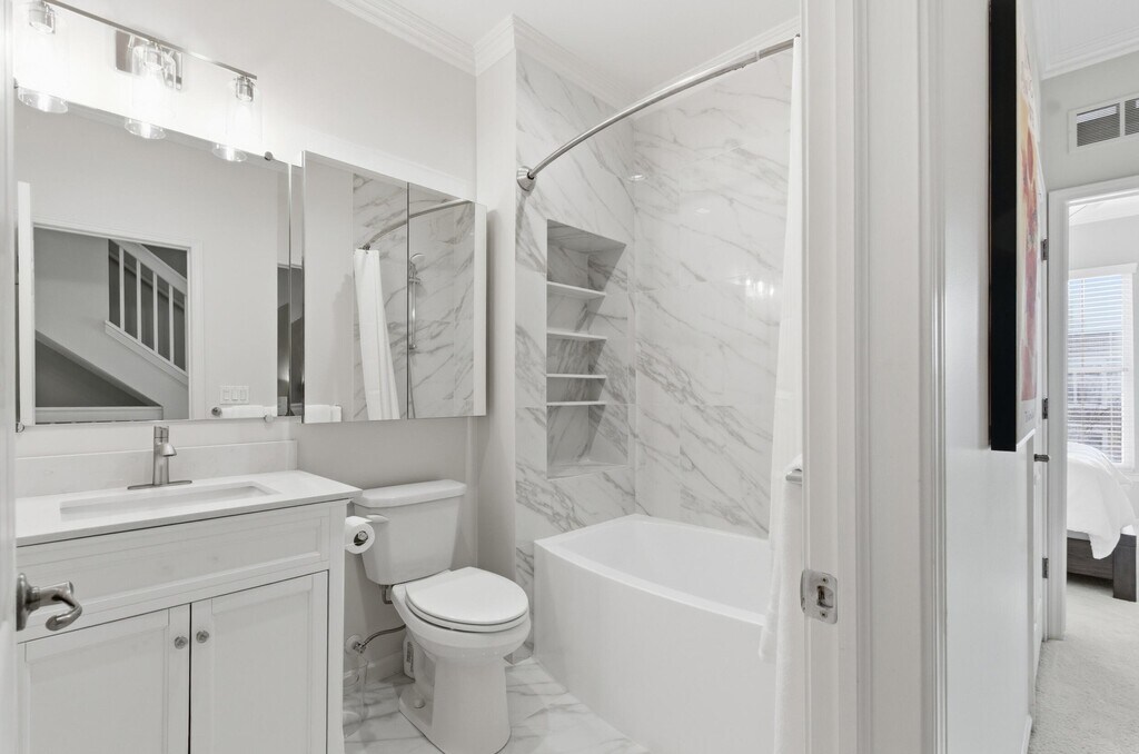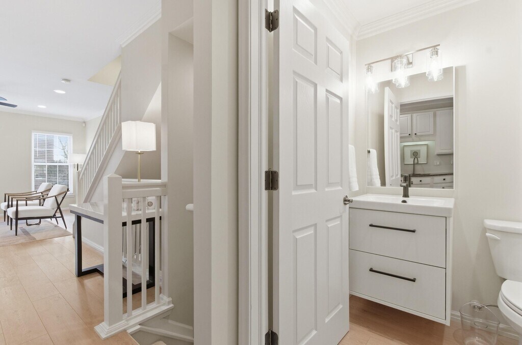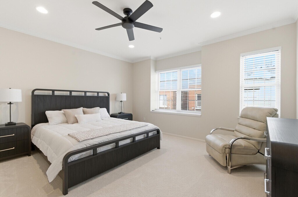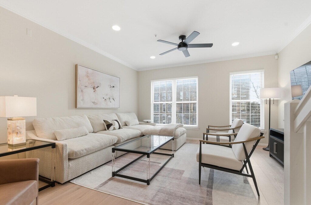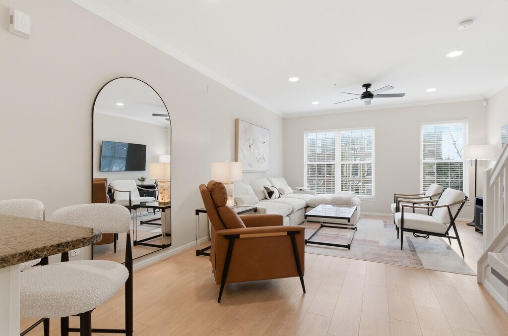 Welcome to one of Eton Street Station's premier Brownstone-style townhomes,newly remodeled and offered fully furnished for turnkey living. This stunning residence features fresh paint,new flooring throughout,and beautifully updated bathrooms blending modern upgrades with timeless style. The main living level offers 9-foot ceilings,crown molding,and a bright open-concept layout with Luxury Oak Vinyl flooring. The off-white kitchen showcases LG appliances (refrigerator,dishwasher,microwave),granite countertops,a butler's pantry/bar,and a breakfast bar for two. A spacious eat-in area with a glass table for six opens to a private deck. A first-floor office with French doors is ideal for working from home. The primary suite includes a custom walk-in closet and spa-like bath with a walk-in shower and Euro-style glass door. The top-floor loft features a full wet bar,beverage fridge,kegerator,seating,and TVperfect for entertaining.